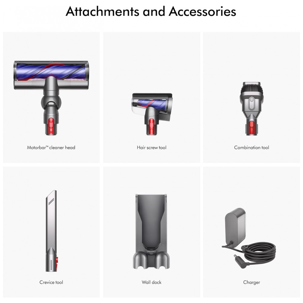 • Acessórios inclusos: Ferramenta combinação, ferramenta crevice, Hair Screw Tool, Motorbar Cleaner Head, tubo extensor (wand), estação de acoplamento, carregador, bateria