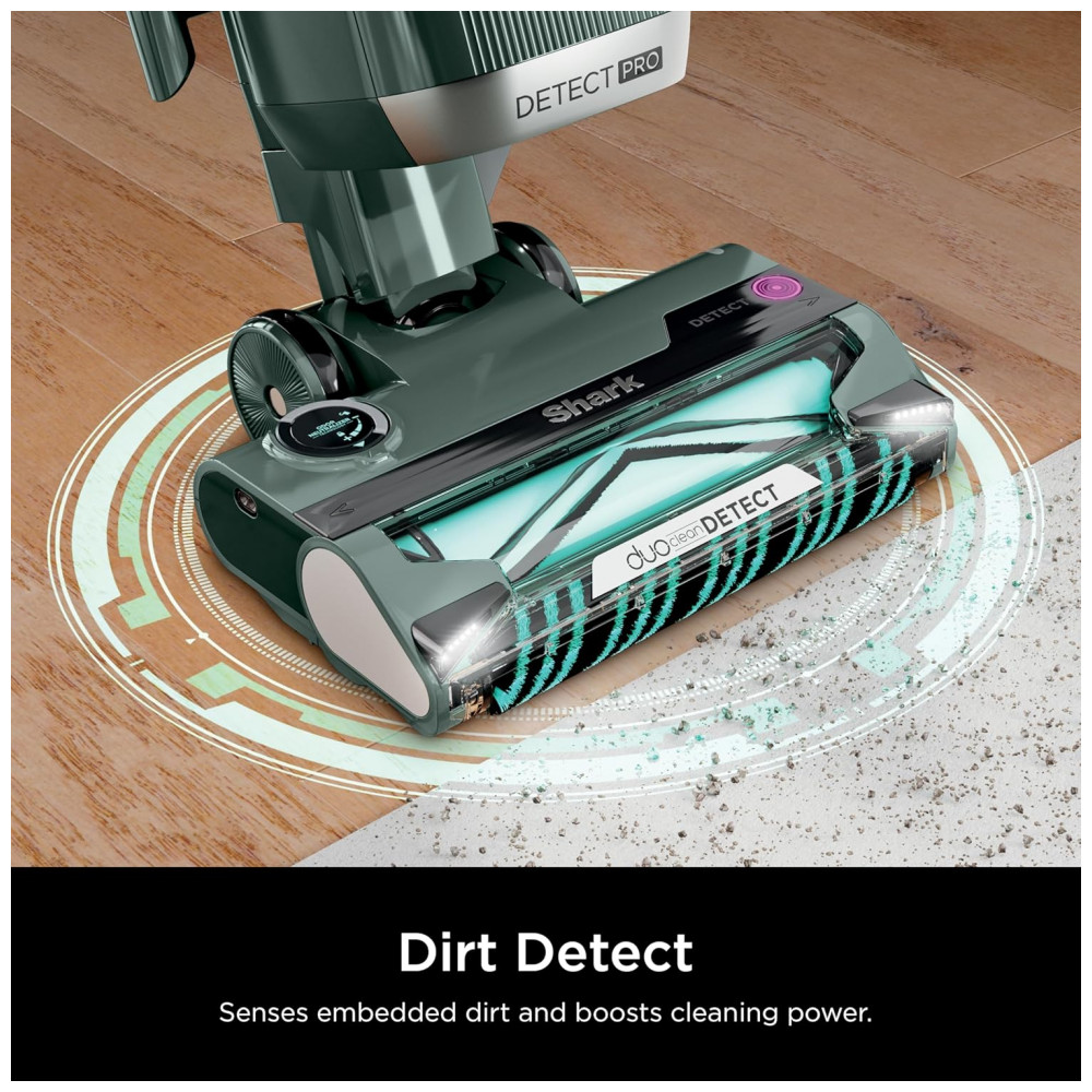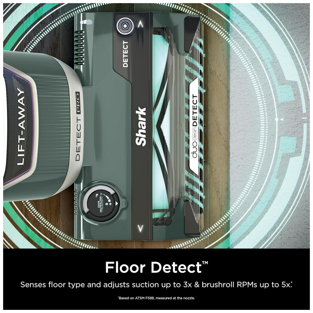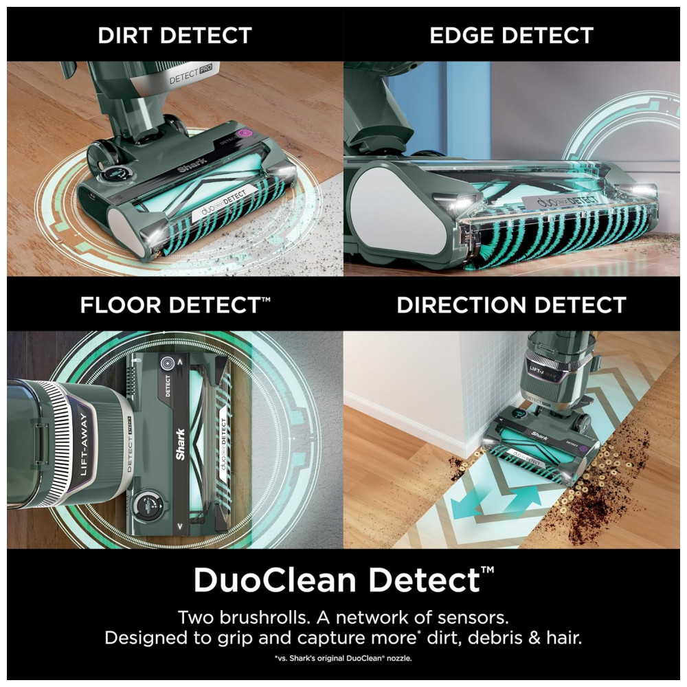 O Aspirador Vertical Shark Detect Pro Lift-Away ADV LA802 integra tecnologia DuoClean Detect com dois rolos de escova e quatro sensores que detectam sujeira oculta, detritos e fios, ajustando automaticamente sucção e velocidade do rolo para desempenho máximo. Recursos como Direction Detect limpam em movimentos forward e reverse, Edge Detect intensifica sucção a até 5 cm de bordas ou paredes, Floor Detect adapta parâmetros por tipo de piso via sensor ultrassônico, e Dirt Detect eleva potência em carpetes densos. Opera com 960 W, 6,5 A e filtro HEPA com selo anti-alérgico para captura eficiente de partículas.