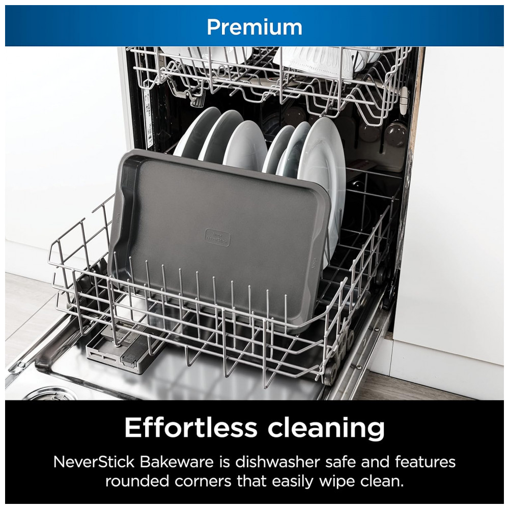 NEVERSTICK BAKEWARE: Projetada para liberar consistentemente os alimentos, permitindo que eles deslizem facilmente da assadeira.