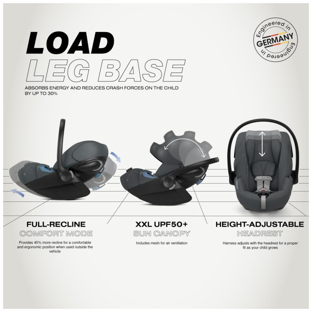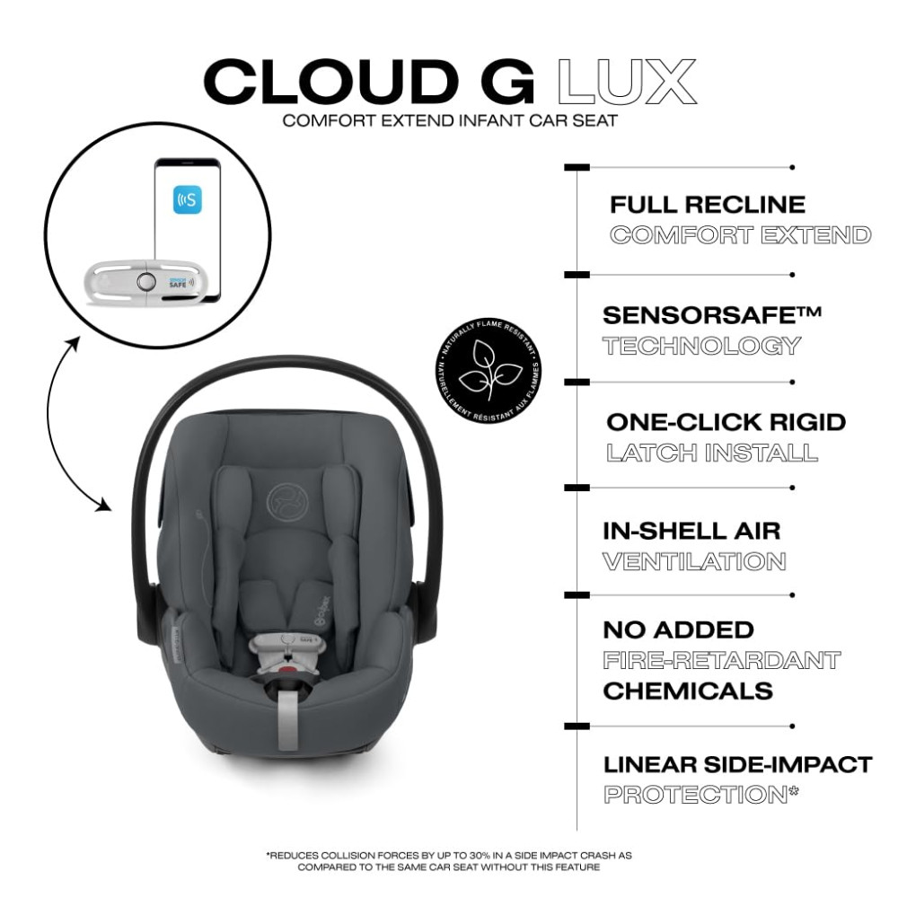 A cadeirinha de carro para bebê Cybex Cloud G Lux Comfort Extend oferece uma posição de reclínio total e um descanso de pernas estendido para uma posição confortável e ergonômica quando usada fora do veículo. Além disso, a instalação com clique único LATCH rígido oferece uma instalação rápida, simples e segura em segundos, enquanto canais de ventilação no assento proporcionam um fluxo de ar natural para manter seu filho confortável. Com o modo de conforto, oferece ainda mais reclínio para uma posição confortável e ergonômica fora do veículo. A base com perna de apoio absorve energia e reduz as forças do impacto em até 30%, enquanto a tecnologia SensorSafe, com clip de peito Bluetooth, envia alertas para o aplicativo móvel se a criança desafivelar o clip do peito, se o banco traseiro ficar muito quente ou muito frio, e se o motorista esquecer a criança acidentalmente. A base anti-rebote reduz as forças no impacto frontal ou traseiro em até 30%.