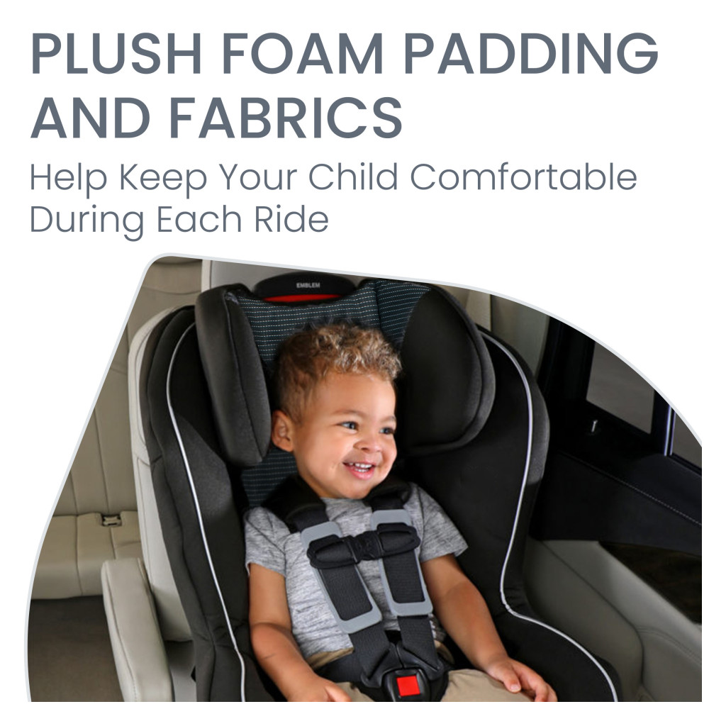 A cadeirinha de carro conversível Emblem ajuda a manter o bebêe confortável em todas as suas viagens Duas camadas de proteção contra impactos laterais envolvem a cabeça, pescoço e tronco Uma estrutura de aço e zona de deformação ajudam a absorver a energia do impacto E a corda em forma de V patenteada ajuda a retardar o movimento para frente para que você possa viajar com tranquilidade A instalação é fácil usando os conectores quickpush LATCH que travam no lugar com um clique Feito com tecidos premium e acolchoamento extraconfortável para passeios fáceis de tirar uma soneca