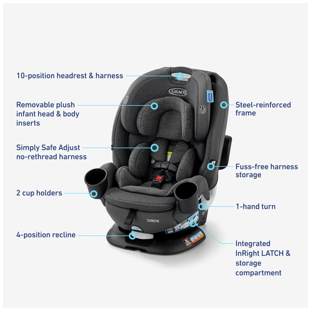A simplicidade e a segurança são a essência da Cadeirinha de Carro Conversível Turn2Me 3 em 1 da Graco. Apresentando rotação com uma mão para fácil acesso ao seu bebê, acompanhada por um clique tranquilizador para indicar uma posição segura para cada viagem. Esta cadeirinha de carro foi projetada para crescer com seu filho, oferecendo três modos de suporte de 1,8 kg a 45 kg de capacidade. Instalada em menos de um minuto com a tecnologia SnugLock, esta cadeira proporciona segurança e conveniência sem complicações. O design Graco ProtectPlus Engineered garante a proteção dos pequenos durante colisões frontais, laterais, traseiras e até capotamentos. Equipada com o Sistema de Arnês NoRethread Simply Safe Adjust, permite o ajuste simultâneo do encosto de cabeça e do arnês em 10 posições para adequar ao conforto e ajuste do seu filho em crescimento. Gire com uma mão para acessar o modo de frente para trás. Use como cadeira com arnês (1,8-20,4 kg), cadeira virada para frente com arnês (9,8-30 kg) e assento elevado (18-45,4 kg). Tecnologia SnugLock para uma instalação em menos de um minuto. Proteção aprimorada com o design Graco ProtectPlus para diferentes tipos de colisões. Sistema NoRethread Simply Safe Adjust para ajuste personalizado do arnês. Escolha entre 10 posições de altura do encosto de cabeça para o ajuste mais seguro conforme a criança cresce. Sistema LATCH seguro com encaixe InRight com um clique audível. Almofadas removíveis para cabeça e corpo ajudam a manter seu bebê confortável e protegido.