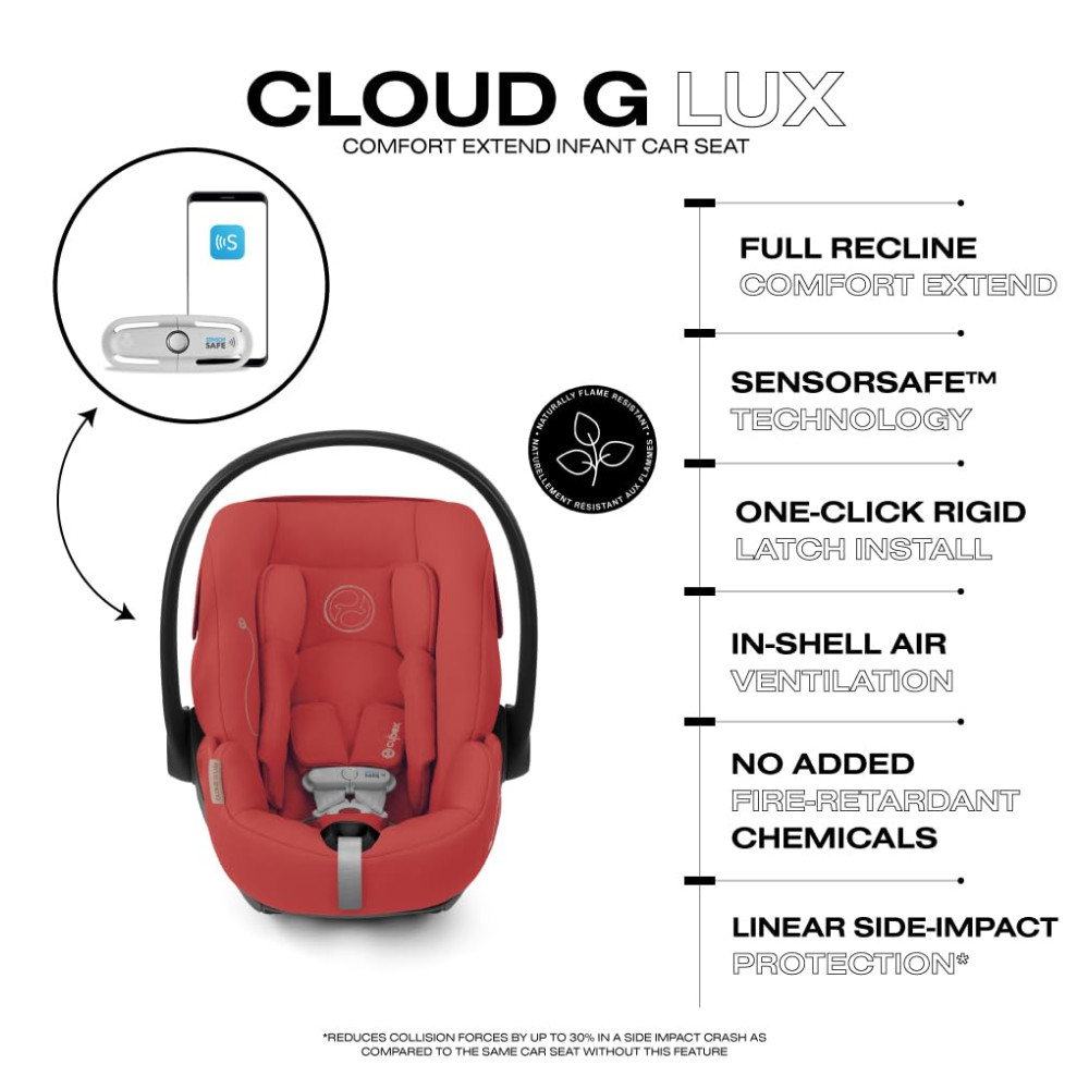 A cadeirinha de carro para bebê Cybex Cloud G Lux Comfort Extend oferece uma posição de reclinável total e um descanso de pernas estendido para uma posição confortável e ergonômica quando usada fora do veículo. Além disso, a instalação por LATCH rígido com um clique oferece uma instalação rápida, simples e segura em segundos, enquanto os canais de ventilação no assento proporcionam uma circulação de ar natural para manter seu filho confortável. Com o modo de conforto com 45% mais reclinável, a cadeirinha proporciona uma posição ergonômica quando usada fora do veículo. A tecnologia SensorSafe, com clip no peito habilitado para Bluetooth, envia alertas pelo aplicativo móvel se a criança desafivelar o clip, se o banco traseiro ficar muito quente ou muito frio e se o motorista esquecer a criança acidentalmente. A base com perna de apoio absorve energia e reduz as forças do impacto em até 30%, enquanto a proteção linear contra impactos laterais reduz as forças de colisão em até 30% em caso de impacto lateral.