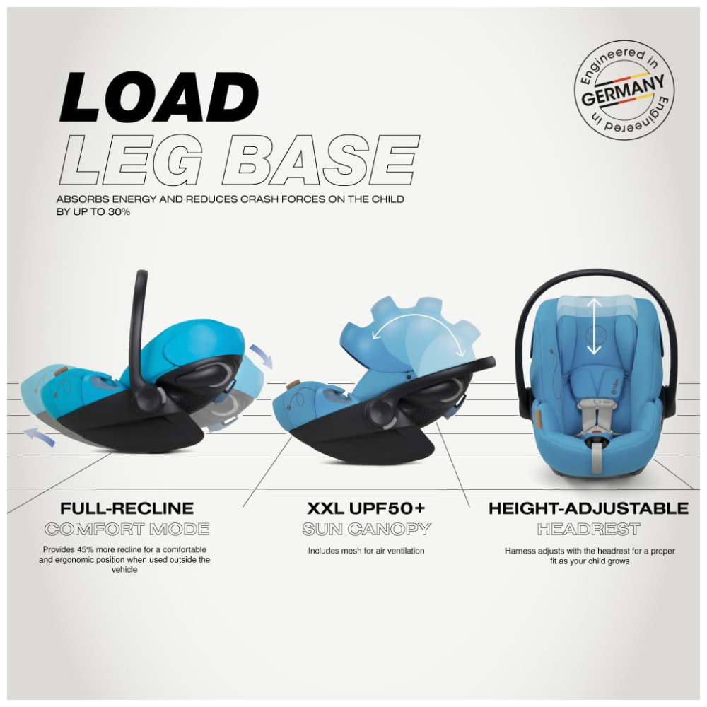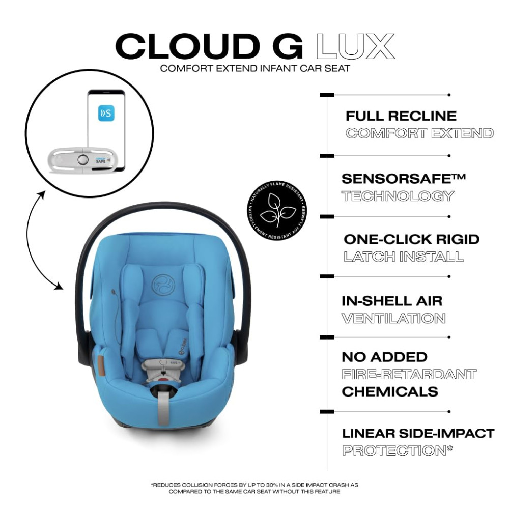 A cadeirinha de carro para bebê Cybex Cloud G Lux Comfort Extend oferece uma posição de recline completa e um descanso de pernas estendido para uma posição confortável e ergonômica ao ser utilizada fora do veículo. Além disso, a instalação com LATCH de clique único proporciona uma instalação rápida, simples e segura em segundos. Os canais de ventilação de ar na cadeirinha fornecem uma circulação de ar natural para manter seu filho confortável. Com 45% a mais de recline no Modo Conforto, proporciona uma posição ergonomicamente confortável. A Base Anti-Rebote absorve energia e reduz as forças do impacto em até 30%. A tecnologia SensorSafe emite alertas por meio de um chip Bluetooth no clipe do peito, avisando sobre desprendimento do clipe, superaquecimento ou resfriamento do banco traseiro e se o motorista acidentalmente deixa a criança para trás. A Proteção Linear contra Impactos Laterais reduz as forças da colisão em até 30% em impactos laterais.
