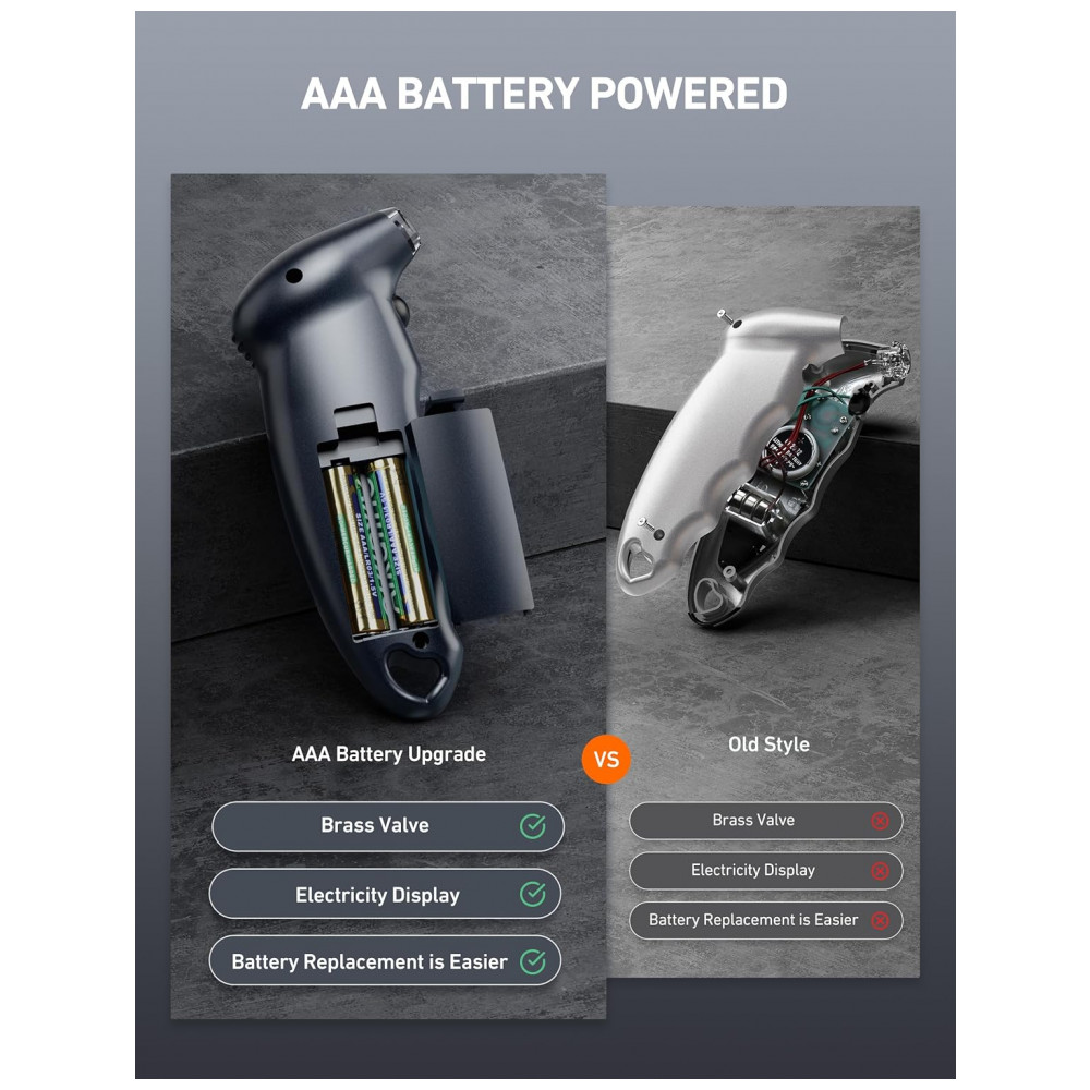 Atualização de Fonte de Energia com Bateria AAA Substituível, em vez de 4 baterias de célula de moeda, 2 baterias AAA estão incluídas neste medidor de pressão de pneus. É fácil para qualquer um substituir as baterias sobressalentes, e as baterias AAA podem durar mais do que as baterias de célula de moeda! Presentes para homens e mulheres. O bico forma facilmente um selo com a haste da válvula em válvulas schrader, fornecendo leituras rápidas e precisas em incrementos de 0,1. 4 configurações com alcance de 0-150 PSI, 0-10 Bar, 0-10 Kgf/cm² ou 0-1000 KPA. Basta pressionar o botão “LIGA/UNIDADE/DESLIGA” para ligar a ferramenta, selecionar o alcance e desligar automaticamente em 30-40 segundos para economizar energia. A textura antiderrapante facilita a aderência e o design ergonômico é adequado para as mãos de homens e mulheres. Projetado para manter a pressão correta dos pneus, reduzir o desgaste dos pneus e prolongar a vida útil dos pneus. A leitura do display digital é mostrada instantaneamente e claramente, não sendo mais necessário adivinhar como nos medidores analógicos. Bateria incluída. Presentes de acessórios perfeitos para carros para homens. Uso versátil para carros, caminhões, motocicletas, bicicletas, etc., mas não é compatível com válvulas presta.