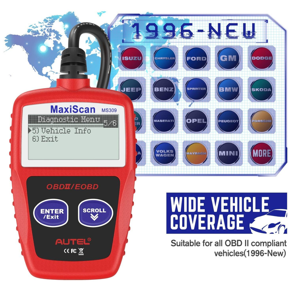 Em resumo, o Autel MS309 é indicado para a maioria dos carros de passeio e caminhões leves fabricados a partir de 2011, sem restrição específica de marca, oferecendo leitura e limpeza de códigos de falhas do motor, monitoramento do sistema de emissões e dados ao vivo.