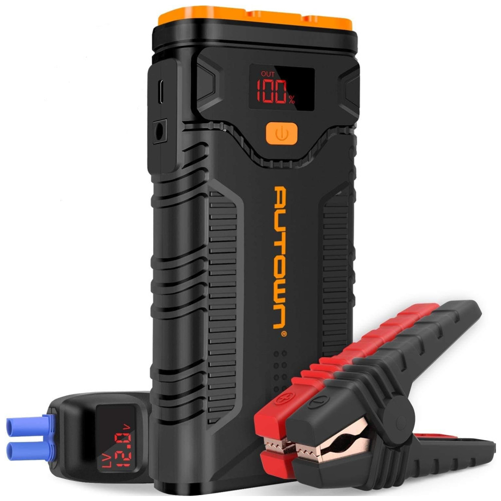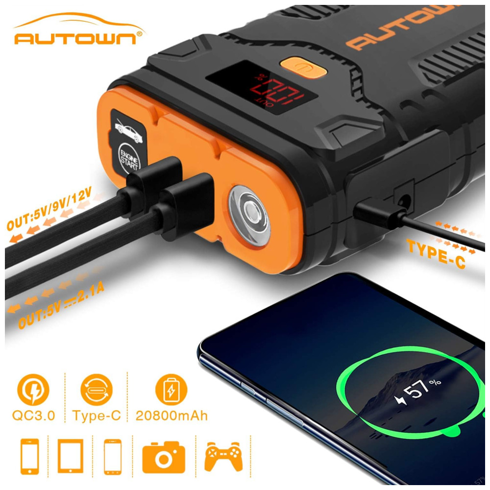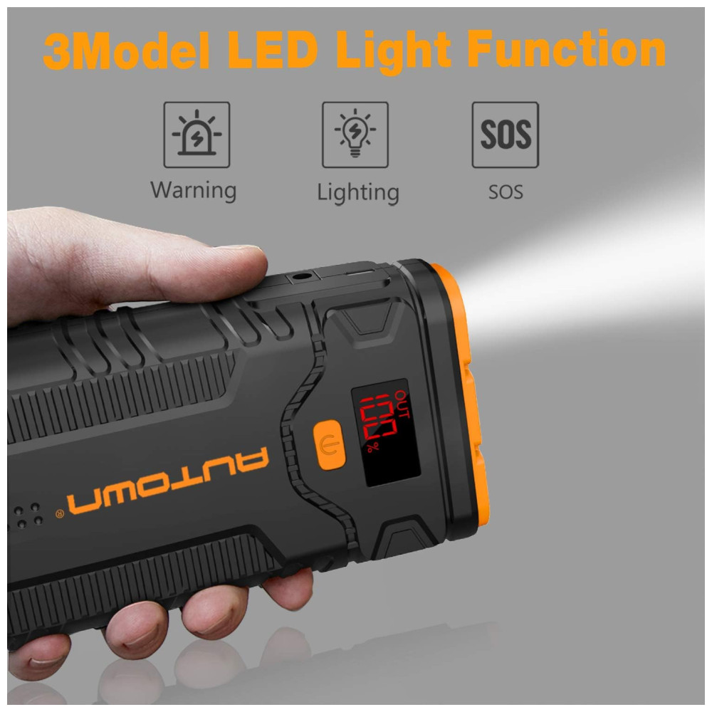 Potente e compacto O impulsionador de bateria AUTOWN até 8.0L Gas , 6.5L Motores Diesel pode dar partida em um carro a bateria de 12V com capacidade de 20800mah 59,2wh. E a corrente de pico até 2000A, adequada para SUV, trilhos, vans ou motocicletas, etc.