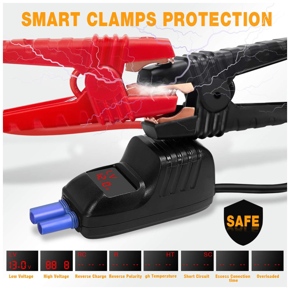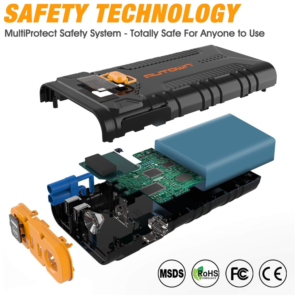 Tecnologia de Segurança Os mais recentes designs de tecnologia de segurança com proteção contra sobrecorrente, proteção contra curto circuito, proteção contra sobrecarga, proteção contra sobretensão, proteção contra sobrecarga, proteção contra alta temperatura, tornando o totalmente para qualquer pessoa usar. A tecnologia QDSP avançada tornou o acionador de partida portátil Autown 3 vezes mais forte do que qualquer outro produto com a mesma capacidade, especialmente em baixas temperaturas.
