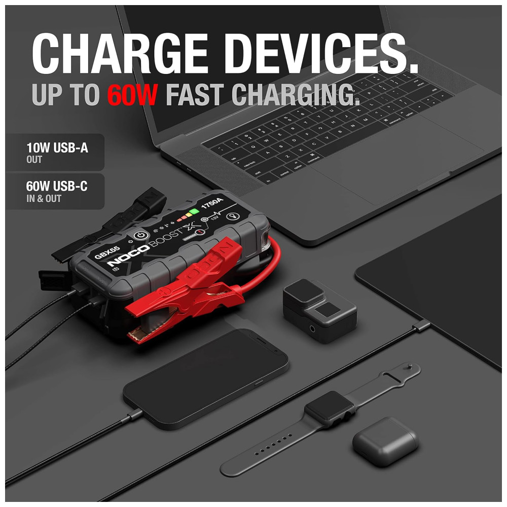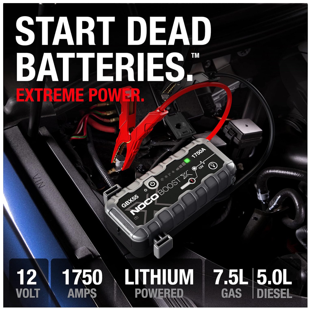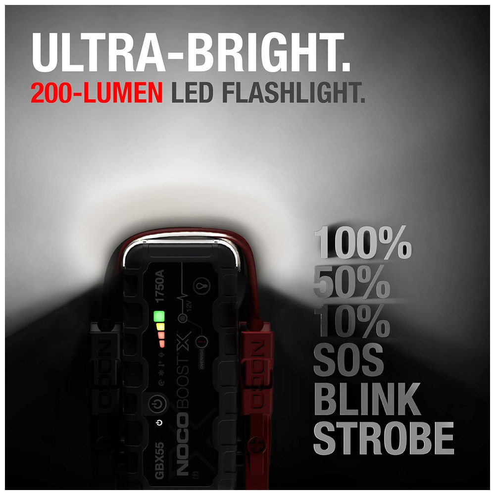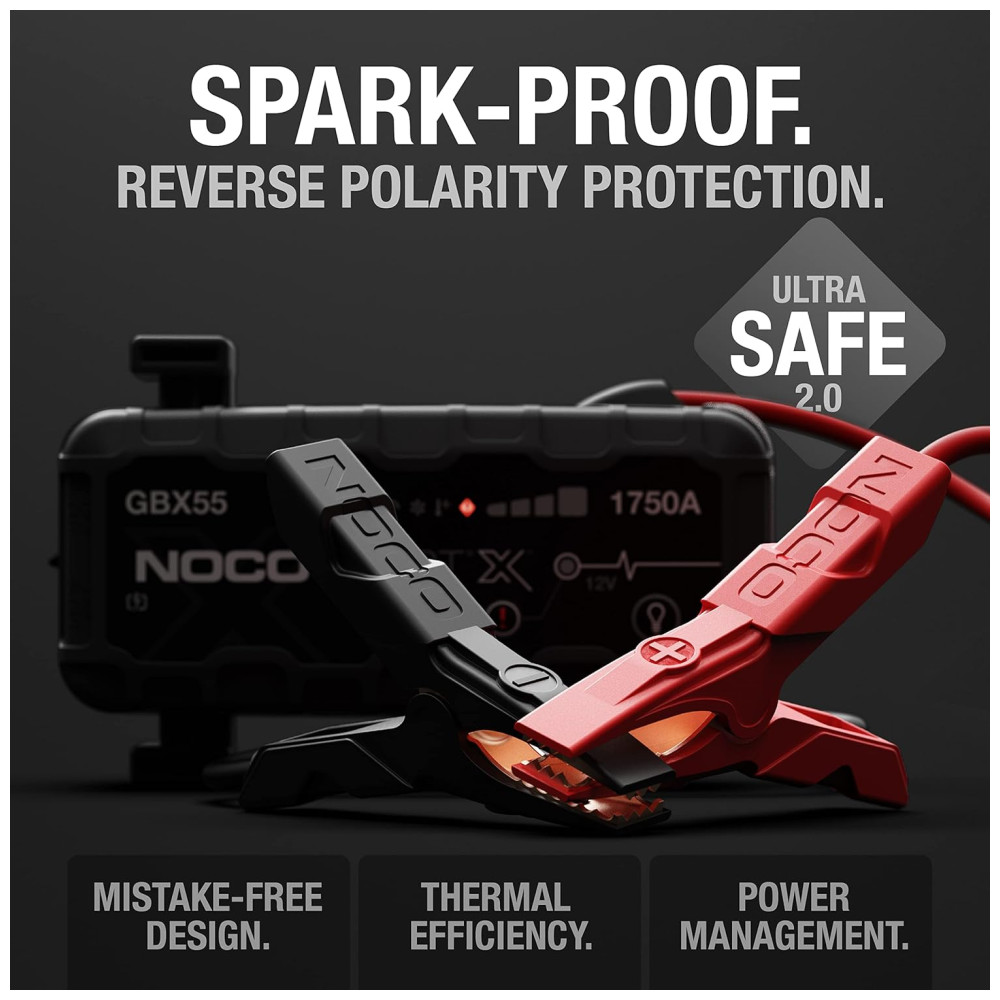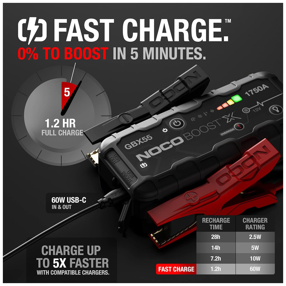 O NOCO Boost X GBX55 é um starter portátil de lítio para baterias de 12 volts em veículos com motores a gasolina de até 7,5 litros e motores a diesel de 5,0 litros. Ele pode ser usado em carros, motocicletas, caminhões, ATVs, barcos, trailers, vans, SUVs, tratores e muito mais. Com uma potência de 1750 amperes, ele libera energia máxima em cada partida. O equipamento vem com tecnologia USBC Power Delivery de 60 W para recarga ultrarrápida, indo de 0 a salto em 5 minutos de carga, além de alimentar dispositivos USBC como telefones, tablets, laptops e wearables. Ele também possui tecnologia de segurança UltraSafe 2.0 com proteção contra faíscas e polaridade reversa, eficiência térmica e gerenciamento de energia aprimorados para melhor desempenho e maior vida útil da bateria. O pacote inclui braçadeiras de cabo de jumper resistentes, cabo de carregamento USBC, bolsa de armazenamento de microfibra. O produto foi projetado nos EUA e é extremamente versátil, podendo ser utilizado em uma variedade de veículos.