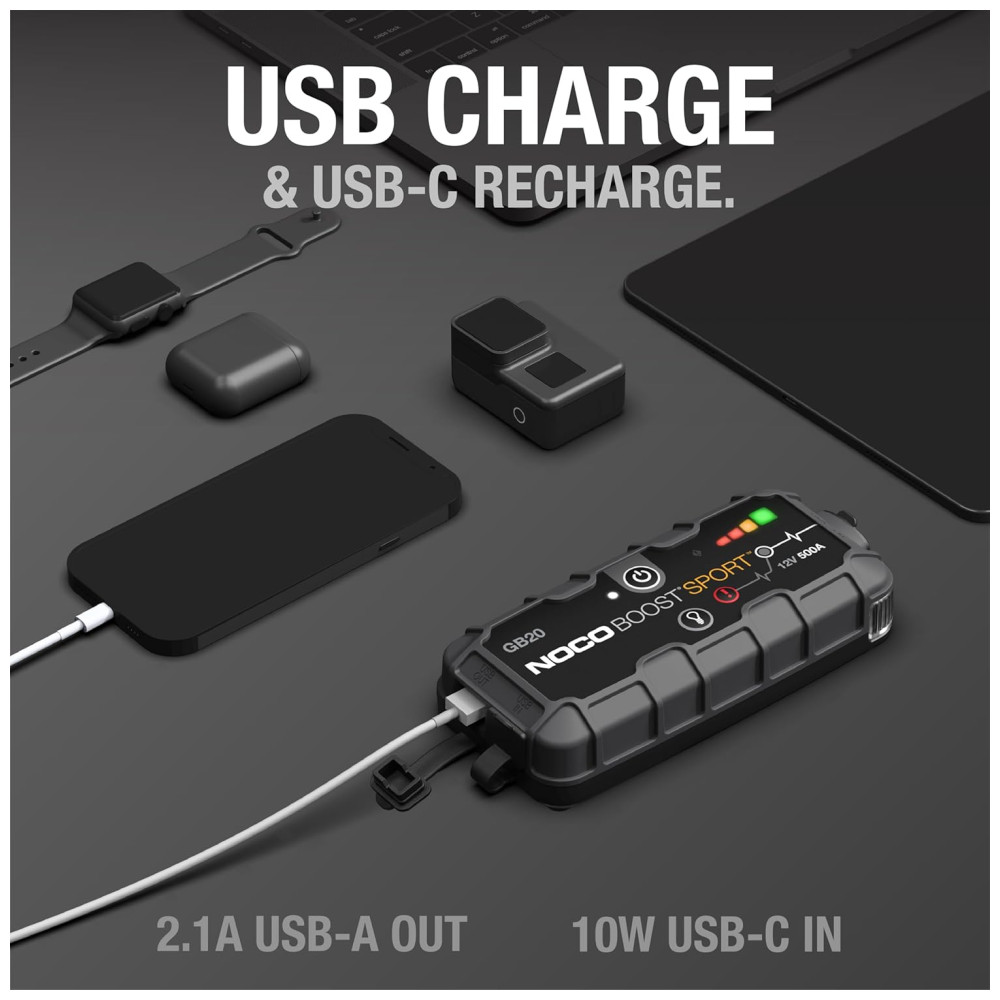 O GB20 é um carregador de bateria portátil, compacto e leve para baterias de 12 volts de carros, motocicletas, ATVs, barcos, caminhões, veículos recreativos, veículos utilitários esportivos, cortadores de grama e muito mais. Com ele, você pode fazer até 20 partidas com uma única carga, sendo um acionador de partida e um pacote de reforço de bateria à prova de erros, tornando o seguro para qualquer pessoa usar, e possui tecnologia à prova de faíscas e proteção contra polaridade reversa. O GB20 também conta com uma lanterna LED de 100 lúmens de alto desempenho integrada com sete modos de luz Baixa, Média, Alta, Piscando, Estroboscópio e SOS de Emergência. Além disso, é possível recarregar qualquer dispositivo móvel pessoal, como smartphones, tablets ou outros dispositivos USB, através da bateria interna que pode ser recarregada por qualquer porta USB alimentada. É avaliado em 500 amperes e é adequado para motores a gasolina de até 4,0 litros. Possui um design avançado, apresentando tecnologia de lítio de alta descarga para operação segura em qualquer clima, um gabinete robusto e resistente à água com classificação IP65 e um invólucro sobremoldado emborrachado para evitar arranhões ou danos às superfícies. É facilmente recarregável a partir de qualquer porta USB alimentada em 3 horas a 2,1 amperes. Na caixa, acompanham o GB20 UltraSafe portátil carro Jump Starter, braçadeiras de reforço para serviços pesados, cabo de carregamento micro USB, bolsa de armazenamento de microfibra, guia do usuário e projetado nos EUA.
