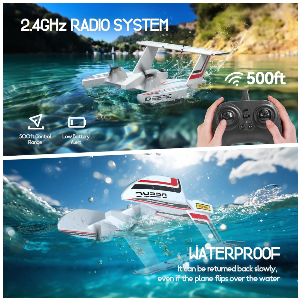 PROJETADO PARA PRECISÃO E SEGURANÇA: O hidroavião RC opera em um sistema de rádio de 2,4 GHz, garantindo uma conexão confiável e livre de interferências em distâncias máximas de 150 metros. Também aumenta a segurança dos voos com dois recursos. O alerta de bateria fraca a bordo notifica os pilotos quando é hora de retornar ou pousar, evitando o esgotamento indesejado de energia durante o vôo. Além disso, o aviso de fora de alcance serve como uma camada adicional de proteção, alertando os usuários caso o hidroavião se afaste muito do controlador.