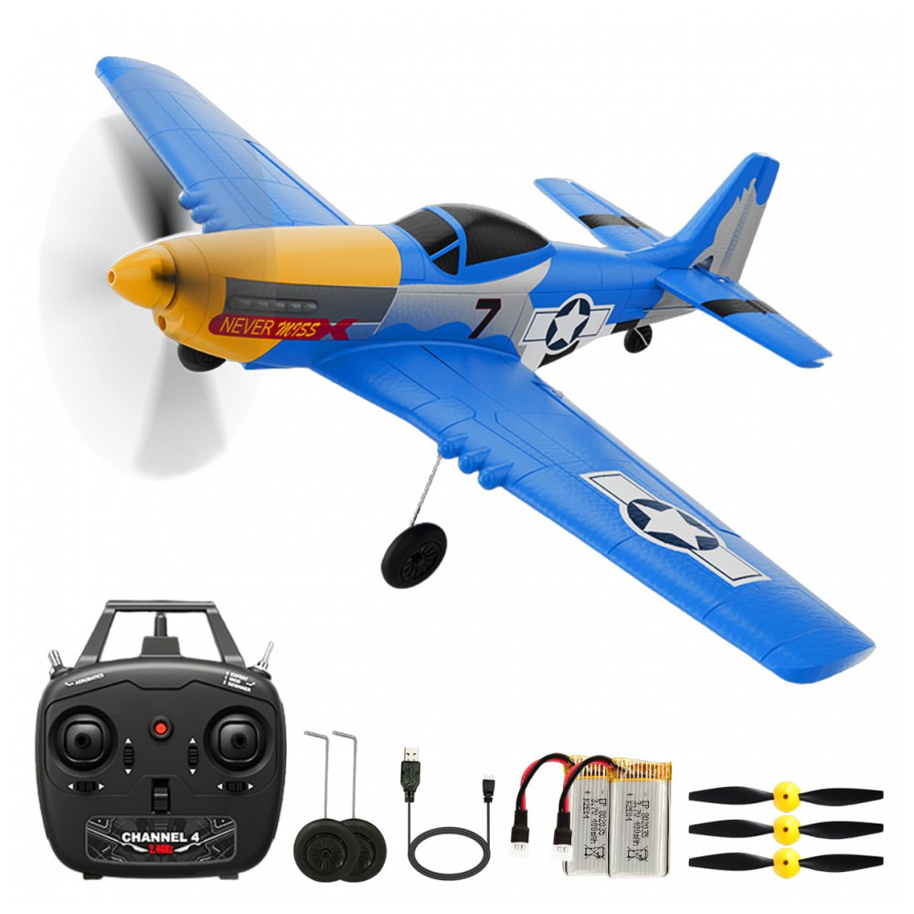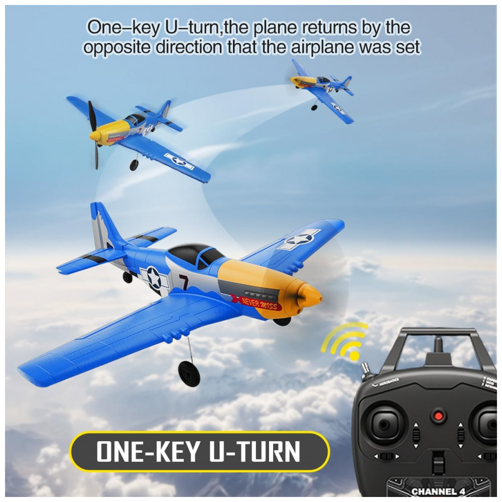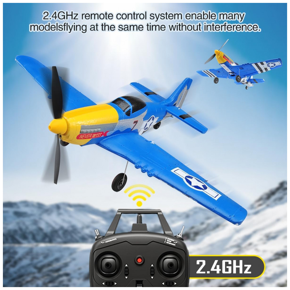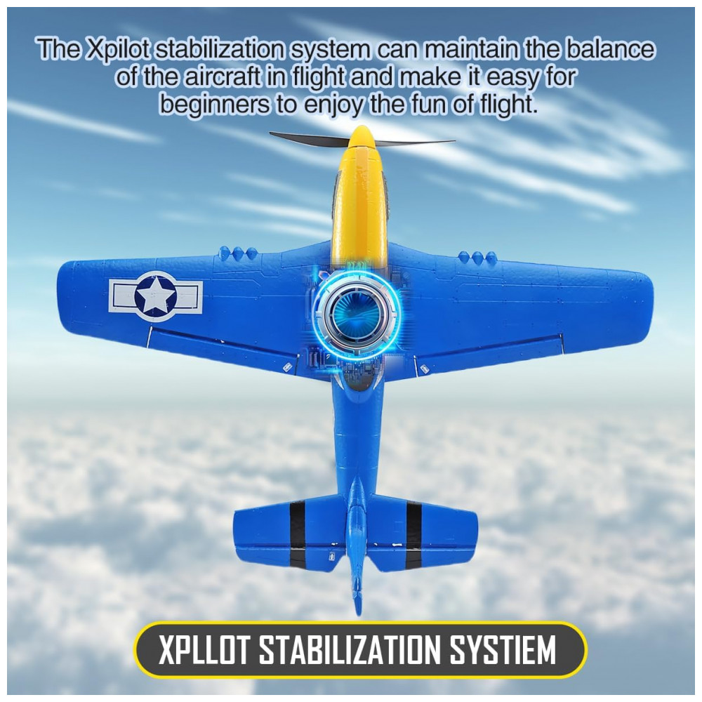 Avião de Controle Remoto com Acessórios Sistema de Estabilização Xpilot de 6 Giroscópios RoofWorld P-51 Mustang 76105 Amarelo e Azul