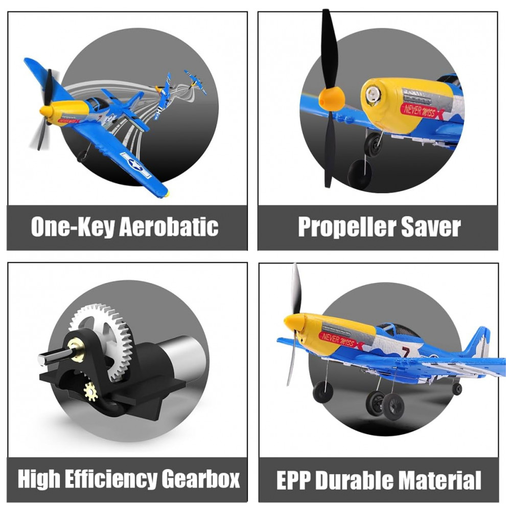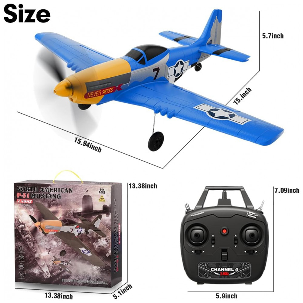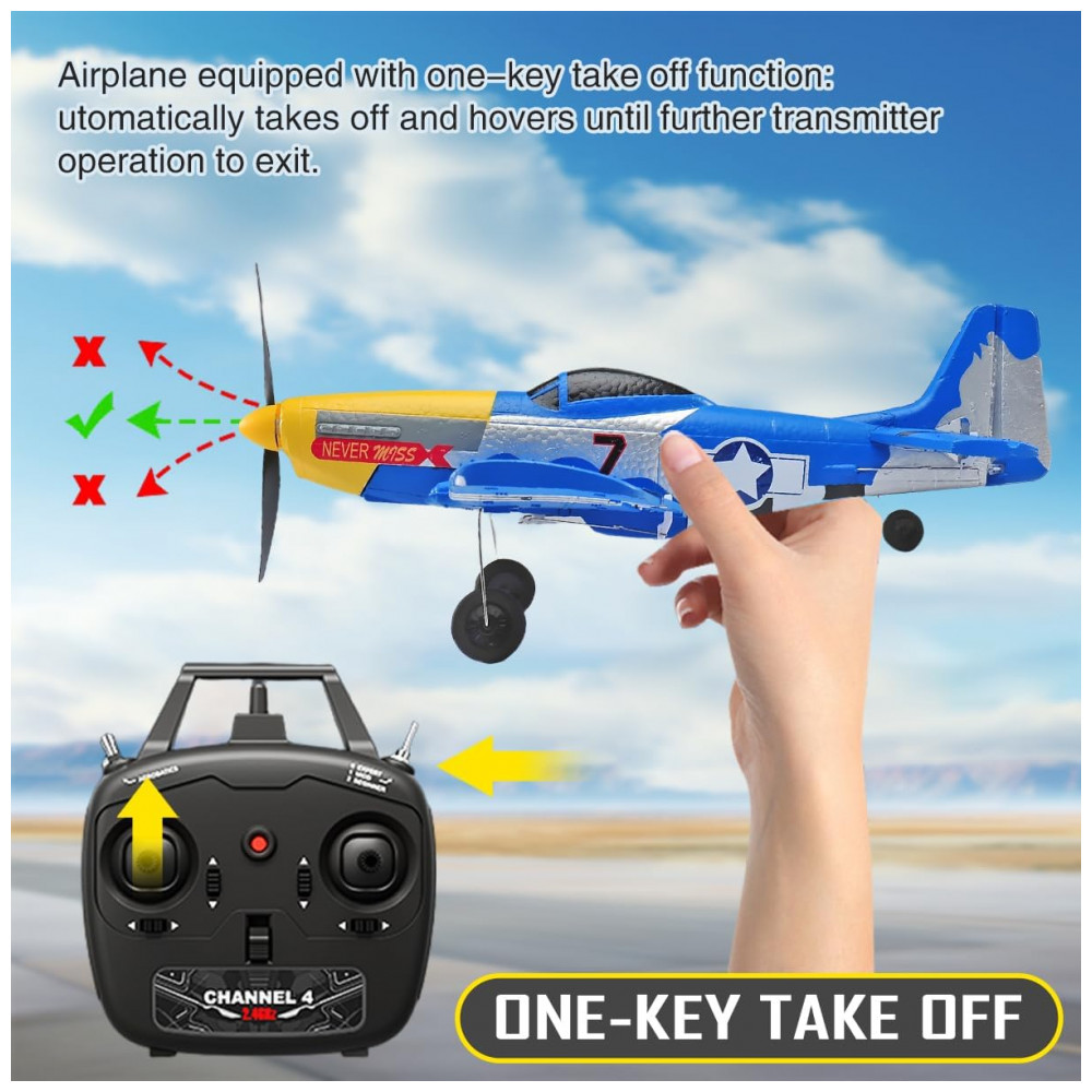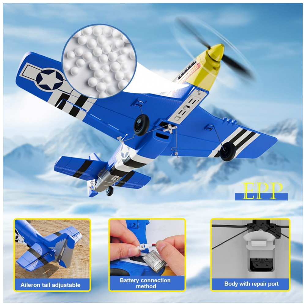 Avião de Controle Remoto com Acessórios Sistema de Estabilização Xpilot de 6 Giroscópios RoofWorld P-51 Mustang 76105 Amarelo e Azul