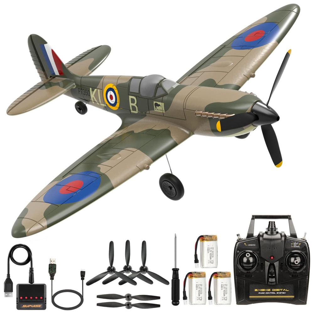 Avião de Controle Remoto de 4 Canais com Sistema de Estabilização Xpilot One Key Acrobatic e Acessórios ANTSIR Spitfire Fighter Verde