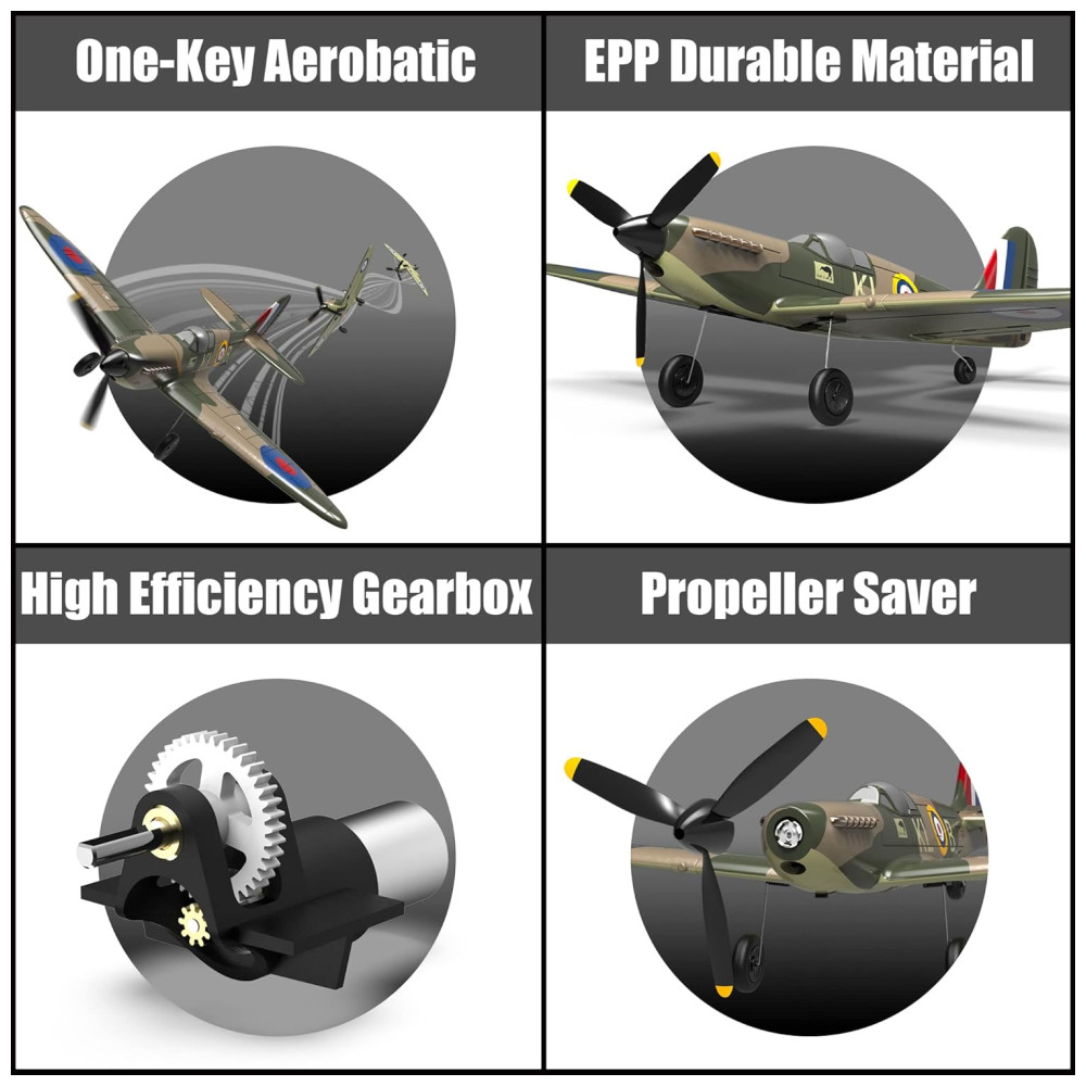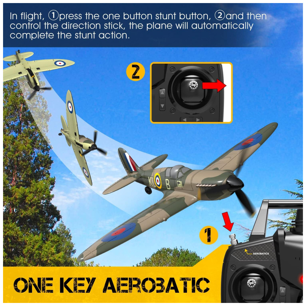 A função One Key Aerobatic permite realizar manobras incríveis com apenas um toque de botão, enquanto a função de retorno automático faz o avião voltar automaticamente para você. Por fim, a pintura sofisticada que simula o caça Warbird Spitfire da Segunda Guerra Mundial torna este produto mais do que um simples brinquedo, um hobby sofisticado.