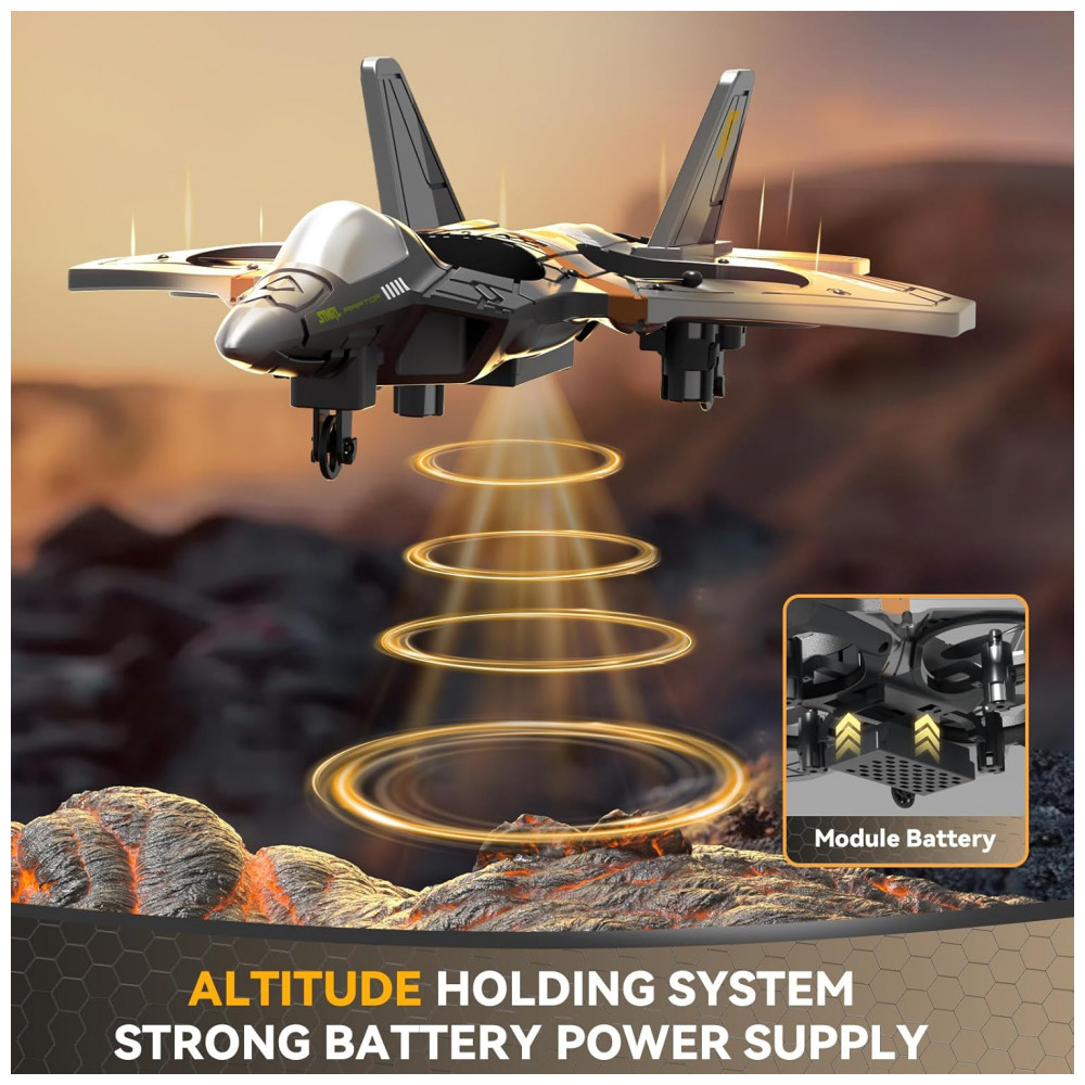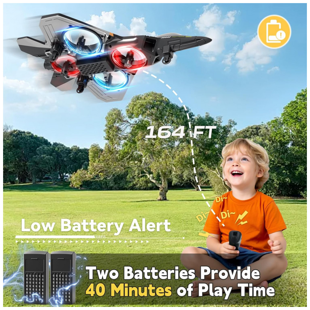 e durável as quatro espirais são embutidas na fuselagem e o estilo estruturado garante um voo . Ao mesmo tempo, protegerá seus filhos de lesões causadas pela rotação da hélice. O material EPP macio e de alta qualidade pode suportar inúmeras colisões ou quedas. Avião de caça muito durável e confiável, adequado para crianças de todas as idades e operadores iniciantes.