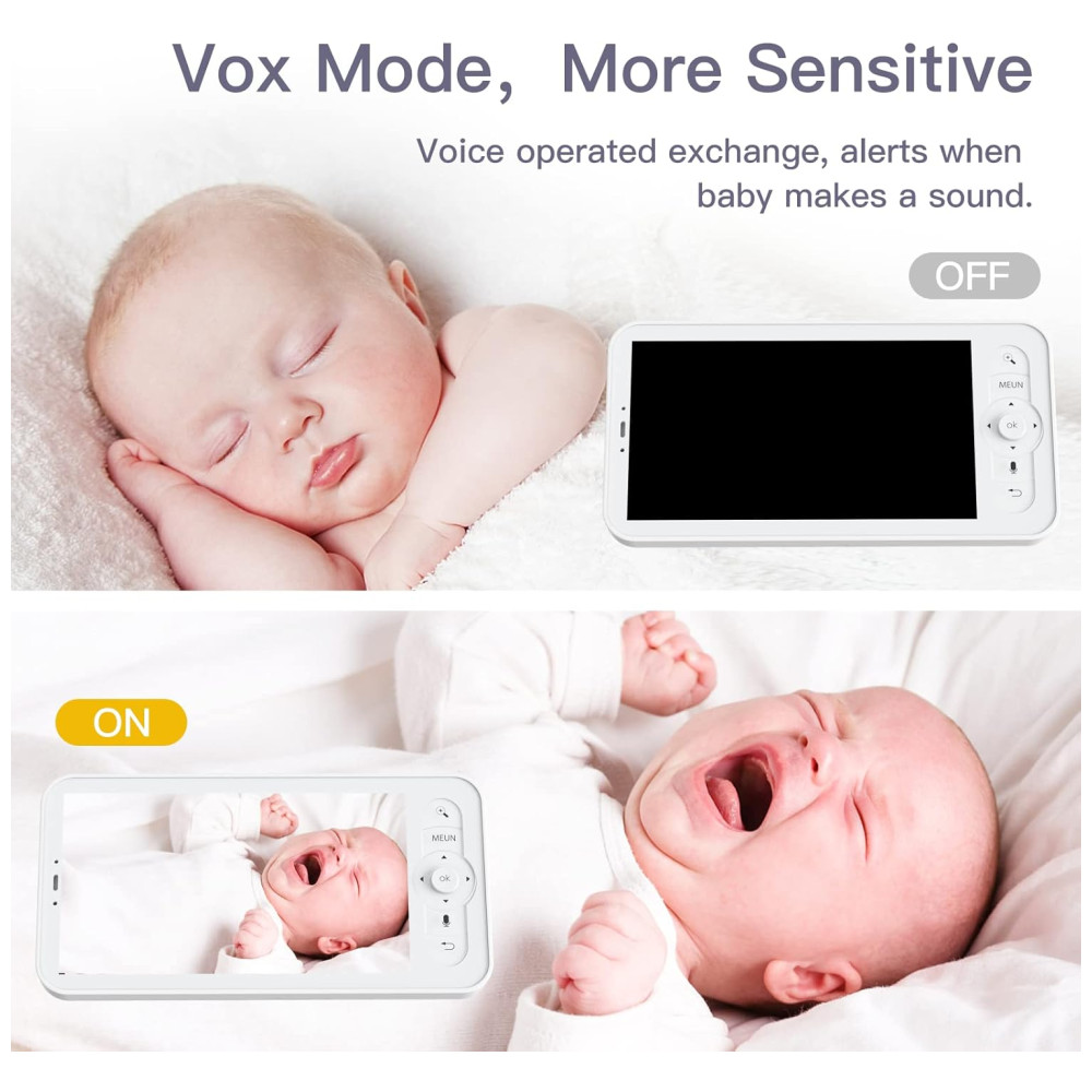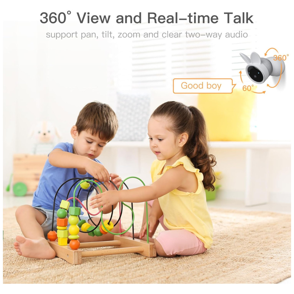 Desfrute de uma tela LCD colorida, maior e mais nítida, com a câmera de bebê de 360 graus, suporte para zoom digital de 4x, permitindo que você veja claramente o que seu bebê está fazendo. Com microfone e alto-falante embutidos, você pode falar suavemente com seu bebê como se estivesse no mesmo cômodo. Além disso, possui armazenamento em nuvem e cartão SD, possibilitando a reprodução de vídeos a qualquer momento. Com detecção de som de choro, detecção de movimento, sensor de temperatura e umidade, lembretes de alimentação, esta câmera oferece camadas adicionais de segurança para o seu bebê.