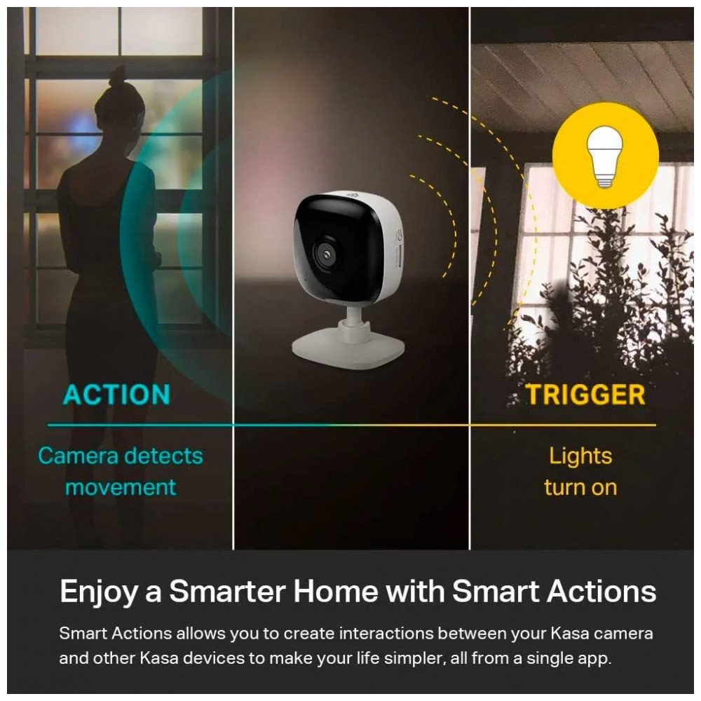 Ações inteligentes como uma das câmeras de segurança mais fáceis de usar, o EC60 oferece uma maneira de configurar suas luzes para acender quando sua câmera detecta movimento com ações inteligentes, que permitem criar interações entre sua câmera e outros dispositivos Kasa.