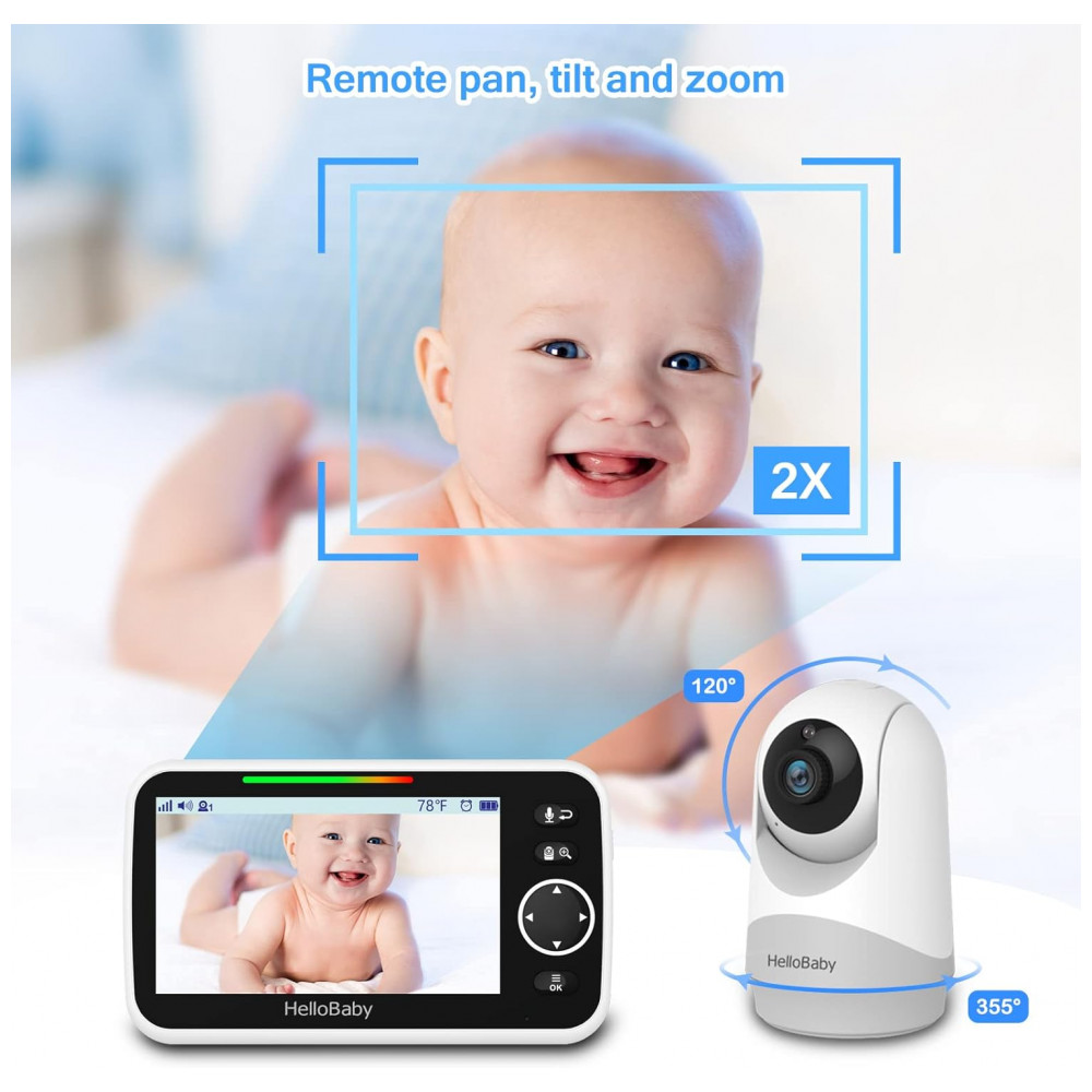 Garantia de privacidade e segurança A babá eletrônica é transmitida via canal interno de 2,4 GHz sem latência de vídeo. E o monitor é plug and play sem WiFi e qualquer APP, que é mais e estável. Áudio bidirecional e visão noturna Você pode falar com seu bebê tão claro como se estivesse na mesma sala em tempo real por meio do recurso de conversa bidirecional. A visão noturna infravermelha automática oferece uma visão clara do berçário, mesmo com as luzes apagadas, para que você possa manter os olhos no bebê o tempo todo. Panorâmica, zoom e inclinação remotos Esta câmera para bebês pode girar 355 na horizontal e 120 na vertical da unidade dos pais, expandindo sua visão de controle o máximo possível. Você também pode operar a unidade dos pais para aumentar e diminuir o zoom para observar melhor o movimento do bebê. Modo VOX O monitor apresenta o modo VOX, que não perturbará seu sono no escuro. Quando o modo VOX está ativado, a tela acende automaticamente quando o choro de um bebê é detectado. E quando o ambiente estiver silencioso, a tela permanecerá preta. O modo VOX prolongará a duração da bateria da tela