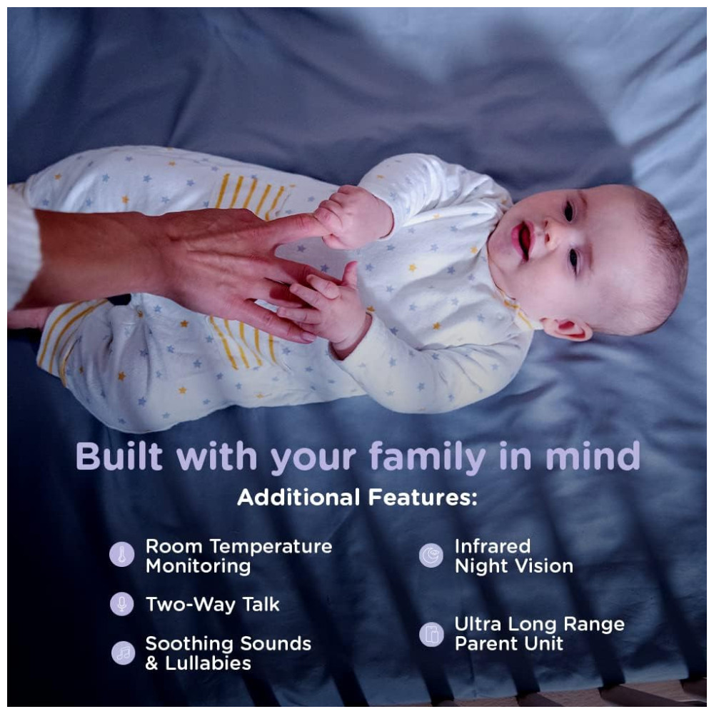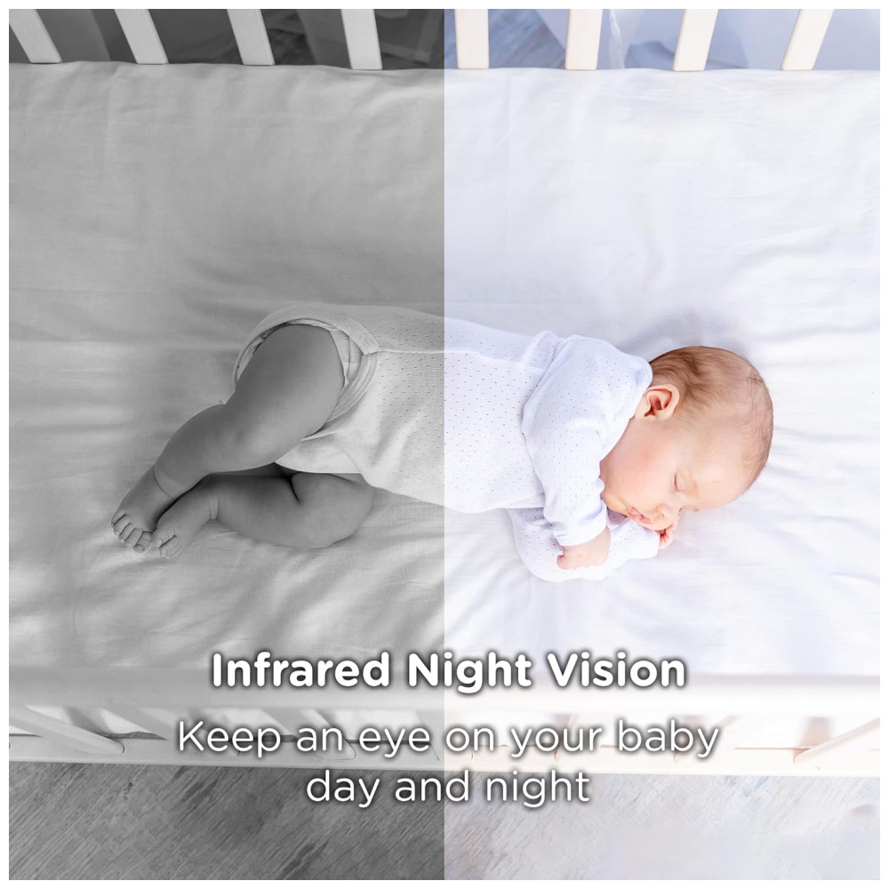 MONITOR DE BEBÊ DE VISÃO NOITE: A câmera de visão noturna infravermelha permite verificar seu bebê no monitor grande do conforto da sua cama durante a noite. Enquanto o recurso de conversa em áudio de 2 vias capta o menor ruído com seu microfone de alta sensibilidade, alertando você quando o bebê começar a chorar