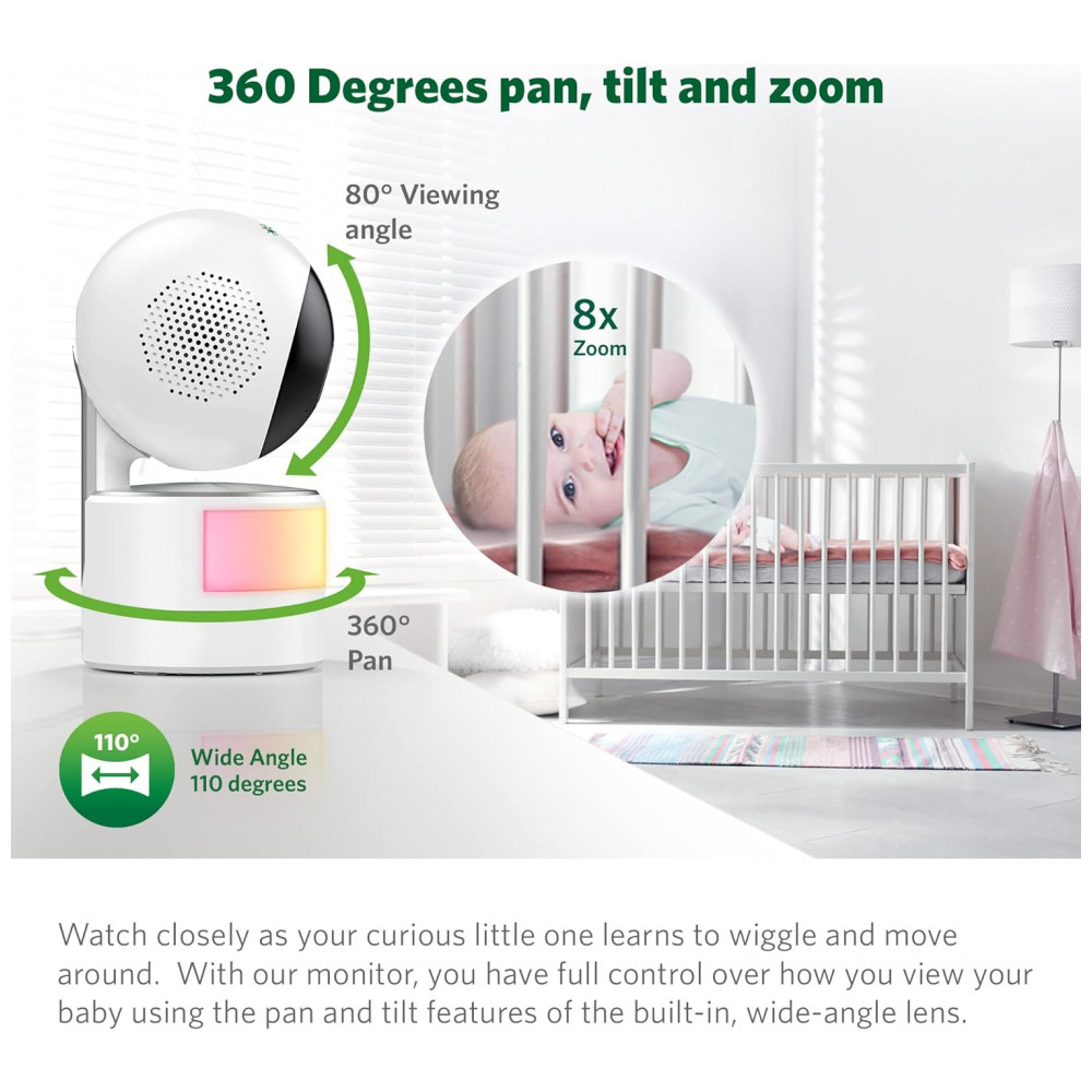 Pan Tilt de 360 graus com zoom 8X e lente grande angular de 110 graus Obtenha visualização panorâmica de 360 graus e aumente o zoom em até 8X para se sentir próximo ao bebê.