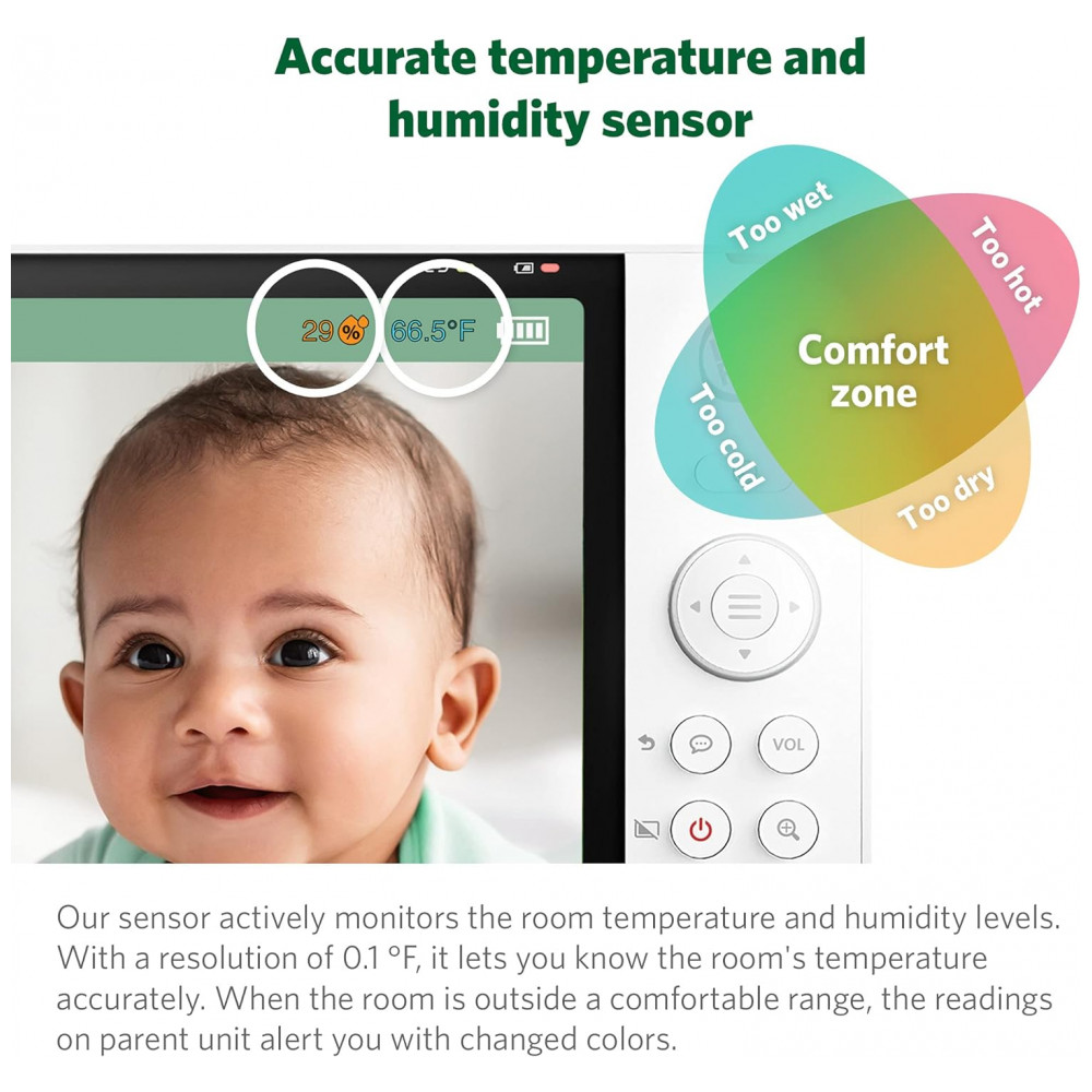 Sensores inteligentes som, movimento, temperatura e Umidade Com sensores inteligentes prontos para alertá lo assim que o bebê fizer alguma coisa ou o ambiente do berçário mudar além do alcance confortável definido por você. Os sensores também podem acionar automaticamente a luz noturna acesa e o som suave quando o choro é detectado. Tudo isso pode ser definido e monitorado constantemente através do visualizador pai
