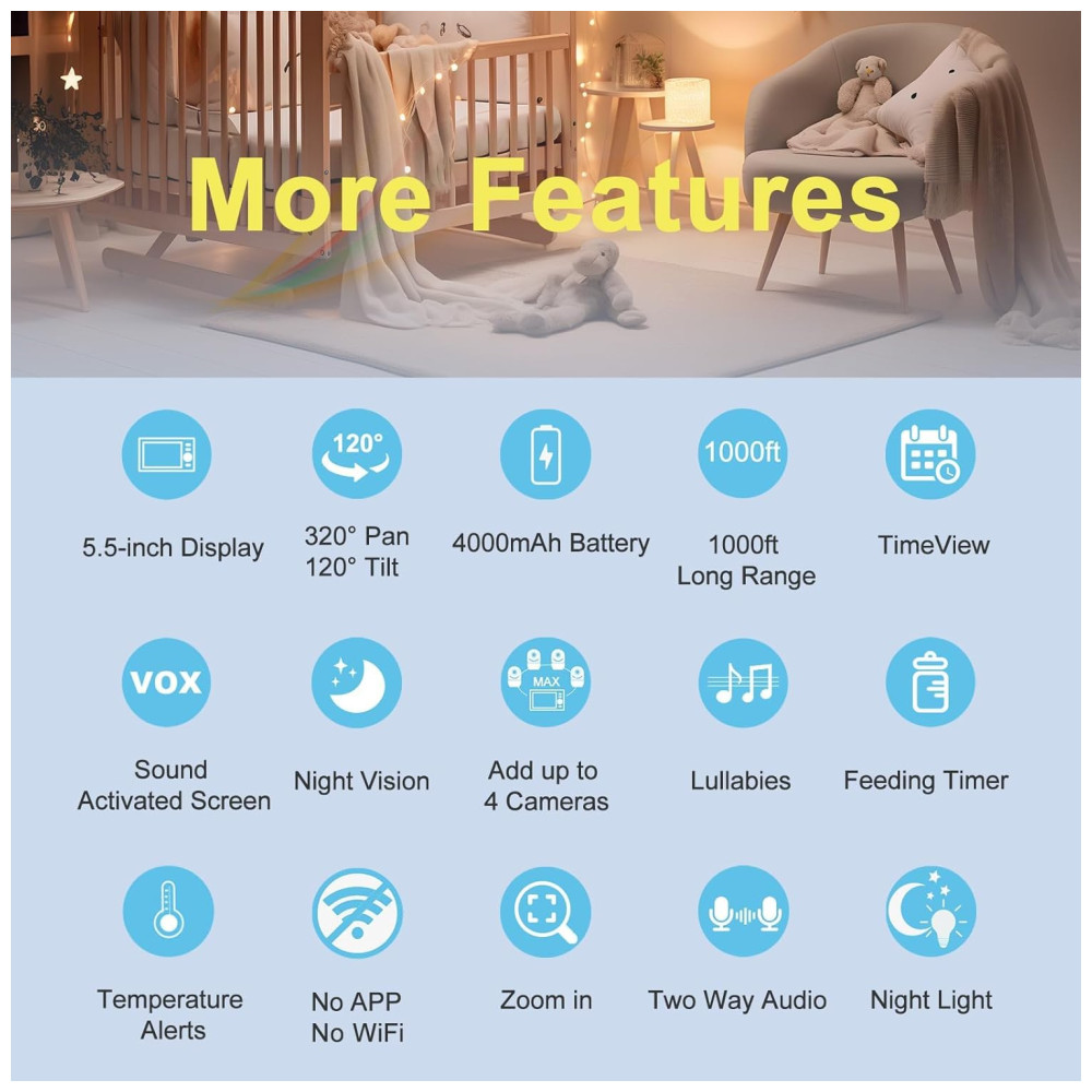 Múltiplas Funções e Presente Ideal: Com bateria de alta capacidade de 4000 mAh, oferece até 11 horas de uso contínuo, permitindo monitoramento sem preocupações. Conta com monitoramento de temperatura, alarme de timer e foco no conforto do seu bebê a todo momento. Suporta 8 idiomas para atender às necessidades de diferentes países. Um presente ideal para a conveniência e paz de espírito dos novos pais.