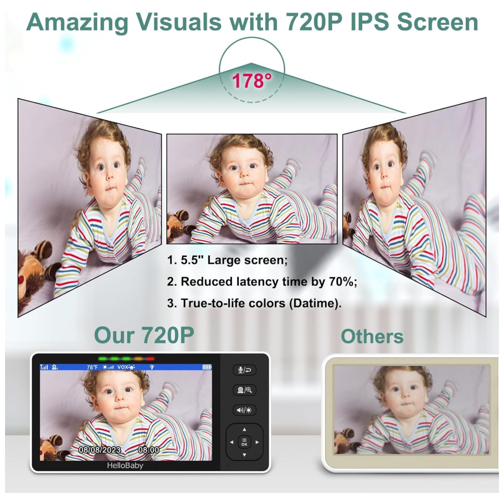 Monitor HelloBaby 5.5” 720P HD com Tela Dividida para 4 Câmeras: O monitor HelloBaby conta com uma tela de 5,5 polegadas e resolução 720P HD, emparelhada com uma câmera 1080P HD para uma visualização mais clara e detalhada. A tecnologia IPS oferece um display mais brilhante, permitindo que você monitore até quatro bebês ou diferentes cômodos ao mesmo tempo, por meio da função de tela dividida. Com apenas um olhar, você terá a tranquilidade de estar cuidando do seu bebê.