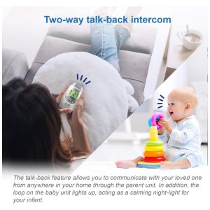 Indicador de som de 5 níveis e intercomunicador bidirecional: LEDs na unidade dos pais mostram o nível de som no quarto do bebê, permitindo que você monitore visualmente o ambiente. Além disso, o intercomunicador integrado permite que você converse com seu bebê de qualquer cômodo.