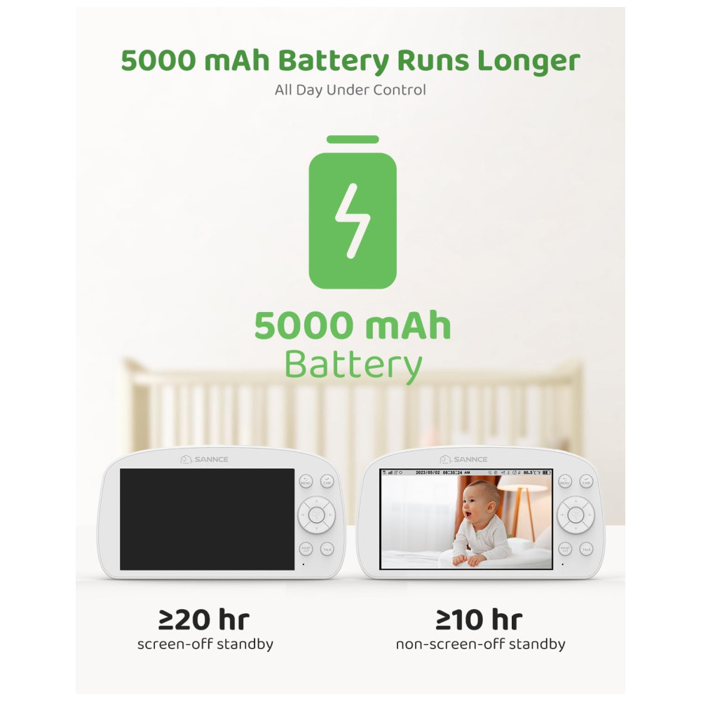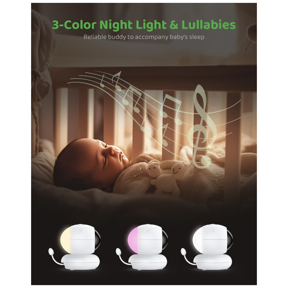 Obtenha o Pan Tilt, uma câmera de vigilância para bebês que permite que você monitore seu filho em tempo real com resolução 1080P e zoom 4X para ampliar a visualização. A tela em cores reais garante que você não perca nenhuma mensagem oculta e as múltiplas detecções tornam as noites mais tranquilas. O dispositivo possui luz noturna de 3 cores acionada por som e 5 canções de ninar para ajudar a acalmar o bebê, além de alertas de som e temperatura anormais. Com a conversa bidirecional, é possível interagir com o bebê e os alarmes inteligentes alertam sobre diferentes níveis de urgência com sirenes de luzes variadas. A bateria de 5000mAh oferece 20 horas de modo de tela desligada e mais de 10 horas de modo de tela ligada. A transmissão adicional permite que você se mova livremente enquanto monitora seu bebê, mesmo através das paredes. Durante a noite, a luz IR permanece invisível para garantir o sono tranquilo do bebê e é possível conectar mais 3 câmeras ao monitor em qualquer sala dentro de um alcance de 303,95 Metros.