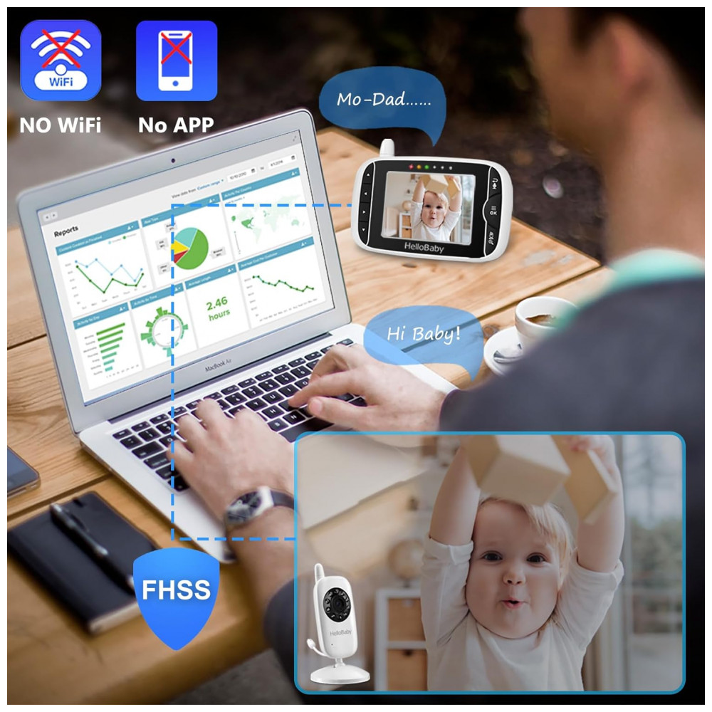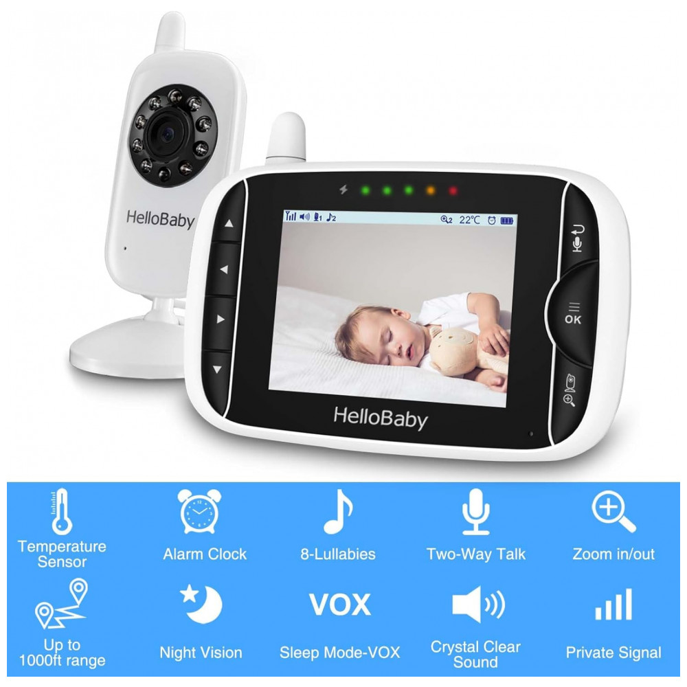 Babá Eletrônica com Câmera Áudio Monitor IPS Modo Vox Visão Noturna sem WIFI HelloBaby Branca