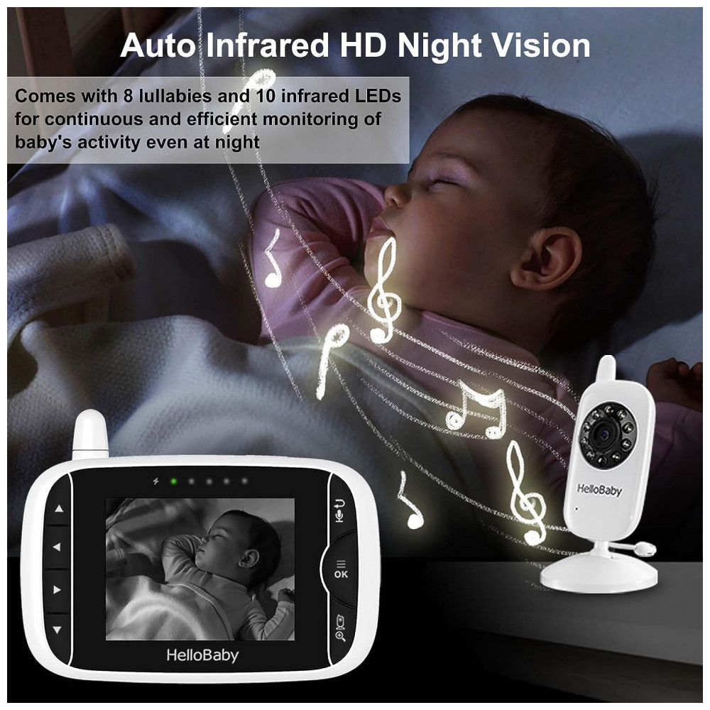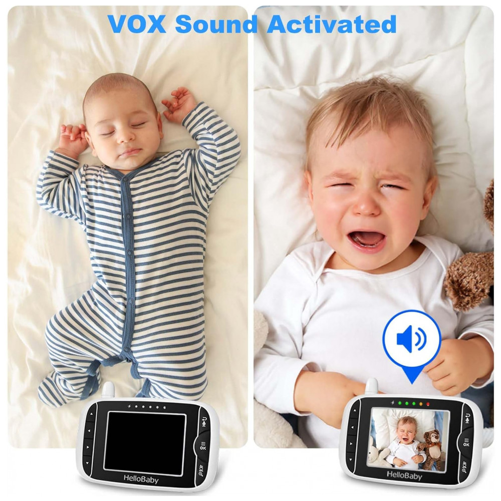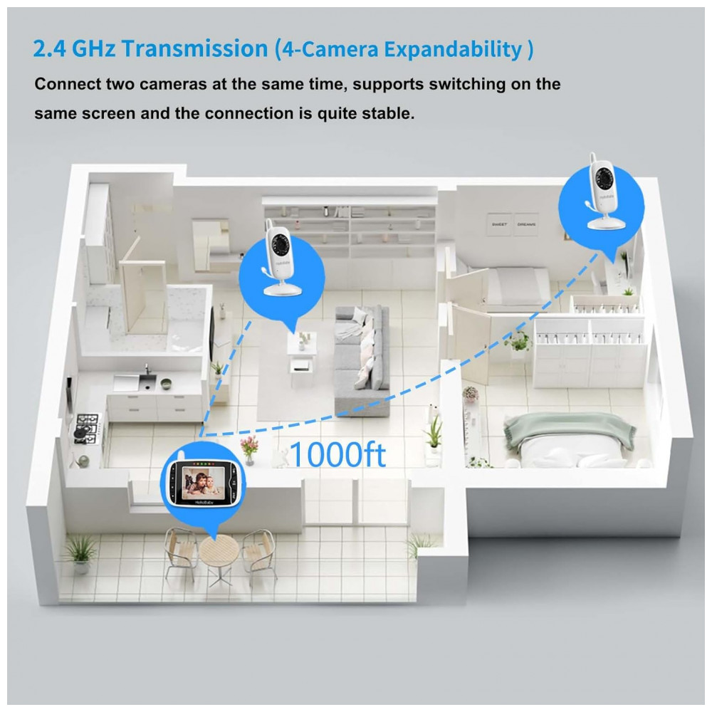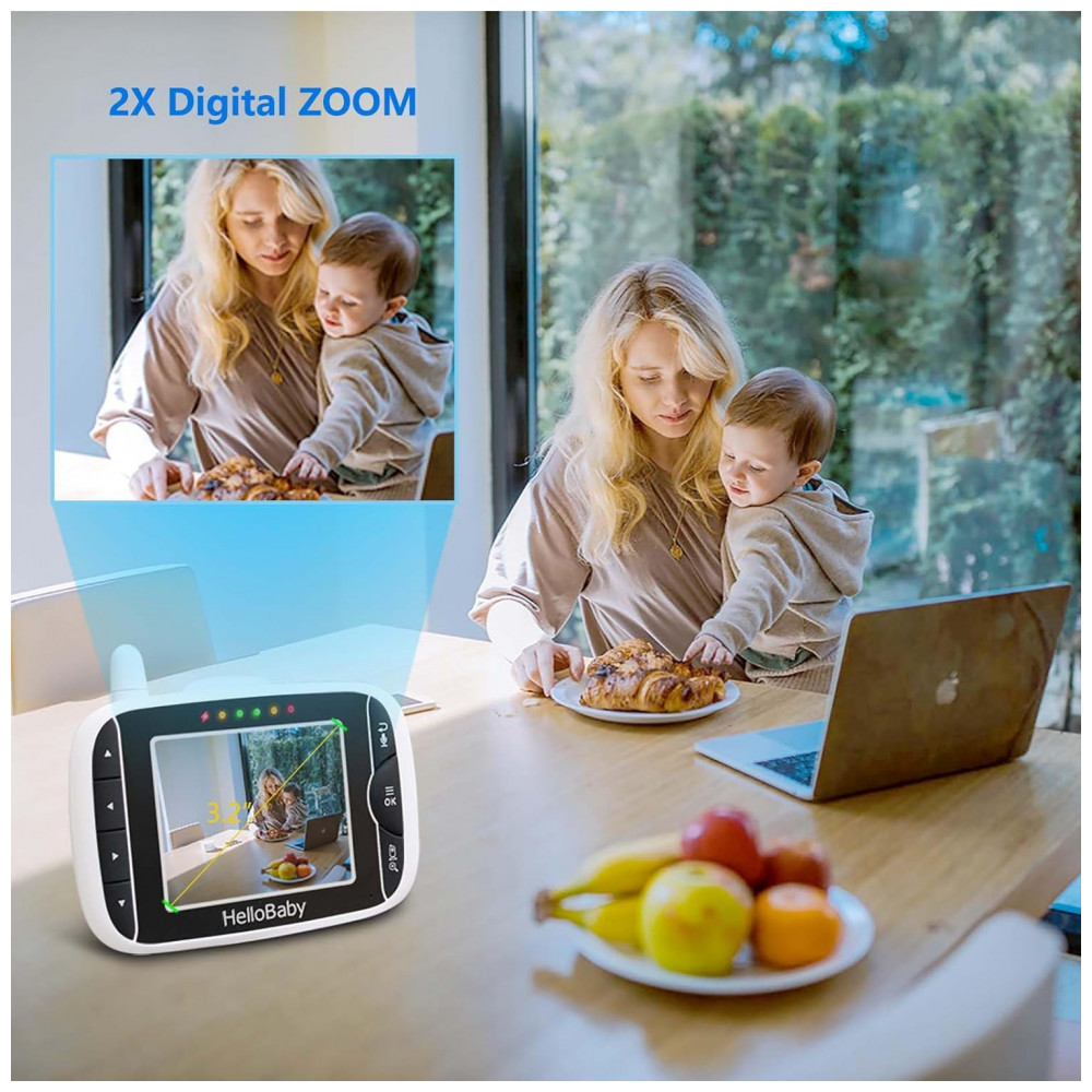 Visão noturna automática de alta definição cada câmera do monitor de bebê possui 10 LEDs infravermelhos para monitoramento contínuo e eficiente da atividade do bebê, mesmo à noite. Ampliação de zoom digital de 2x, panorâmica manual de 360 e função de inclinação de 60 para cobertura total do quarto do bebê.