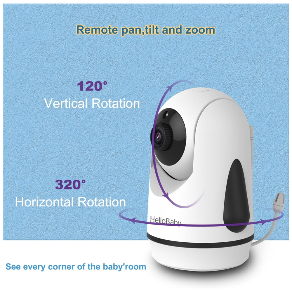REMOTE PAN TILT e ZOOM A câmera de controle remoto gira 355 na horizontal e 120 na vertical, garantindo que você sempre tenha uma visão clara do seu bebê de qualquer ângulo.