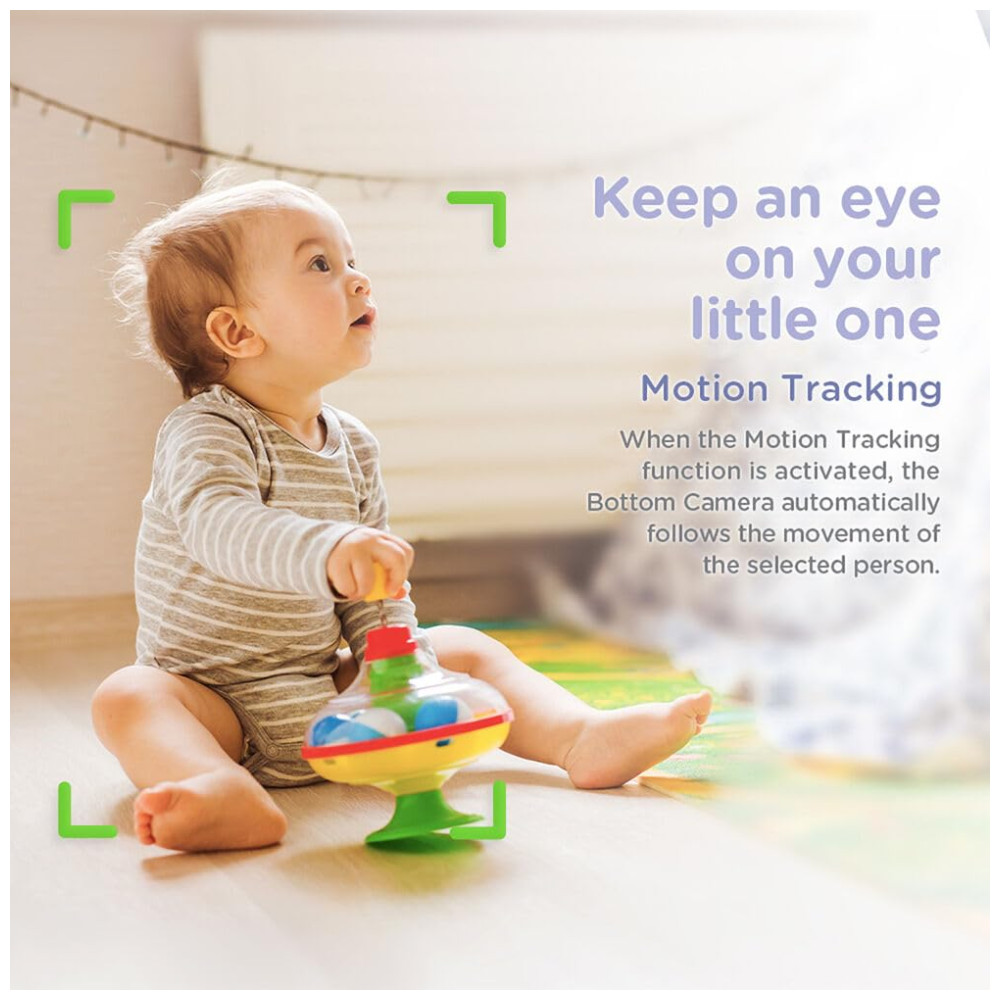 A câmera inteligente Dual Vision Nursery Pal oferece uma visão ampla e regular simultaneamente, proporcionando aos pais uma experiência de monitoramento abrangente e detalhada de seu bebê e da creche. A câmera de rastreamento de movimento por IA gira e inclina automaticamente para manter seu bebê no quadro, garantindo que você nunca perca um momento e possa sempre ficar de olho em seu pequeno.