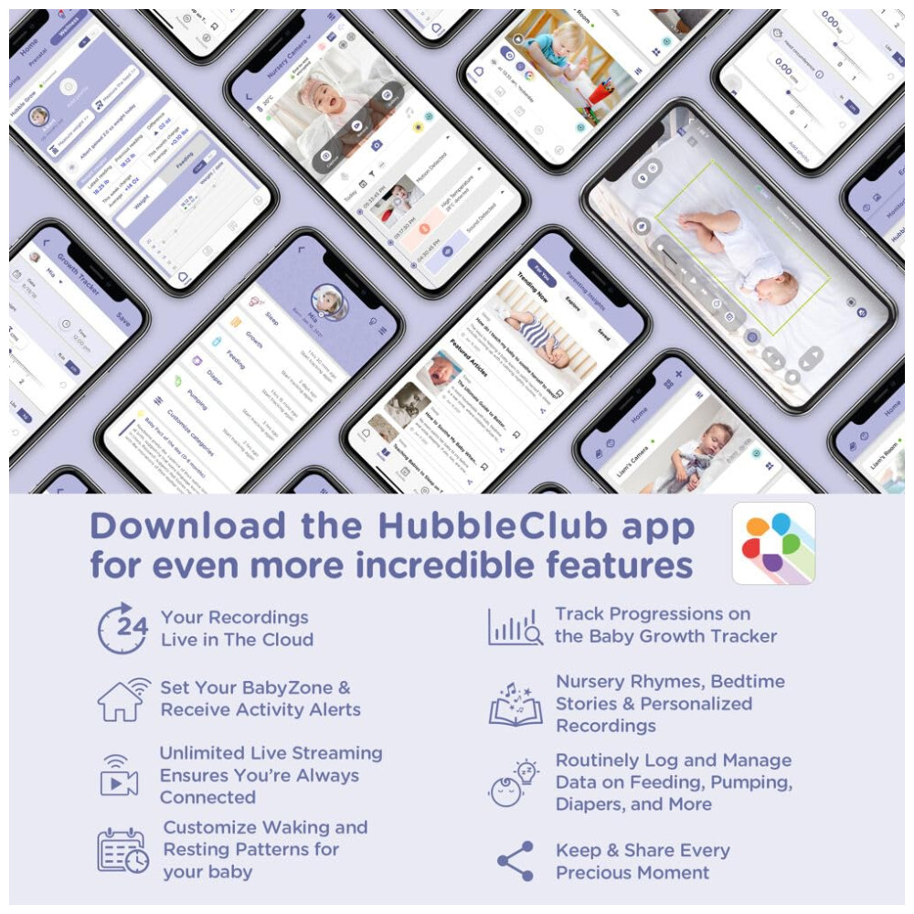 Mantenha se conectado com seu bebê, não importa onde você esteja, usando o aplicativo HubbleClub em seu smartphone. À medida que seu bebê cresce, o recurso ConnectChat permite uma comunicação bidirecional fácil entre pais e filhos, permitindo que você os conforte e se comunique com eles remotamente. Por meio do aplicativo HubbleClub, gerencie e monitore o ambiente do seu bebê, acesse os dados do rastreador de crescimento do bebê e armazene com segurança momentos preciosos capturados na nuvem do HubbleClub.