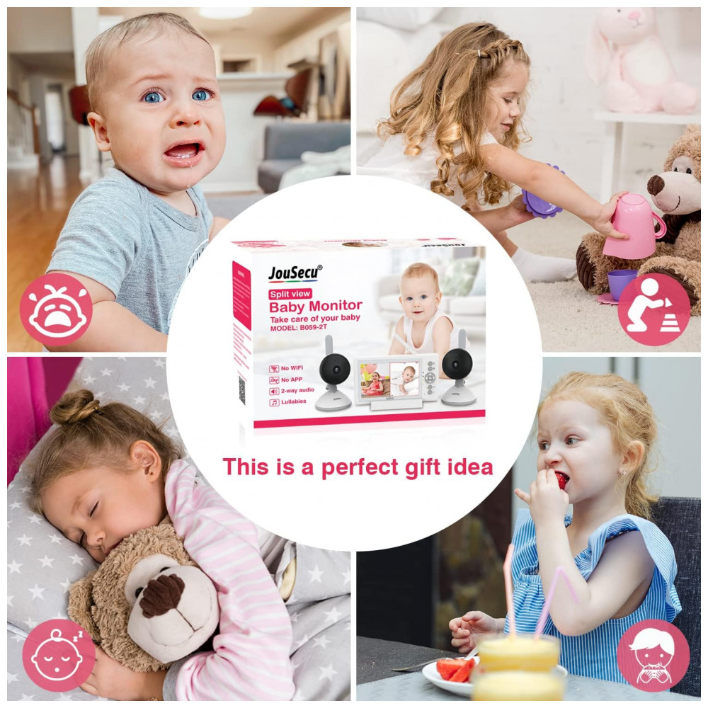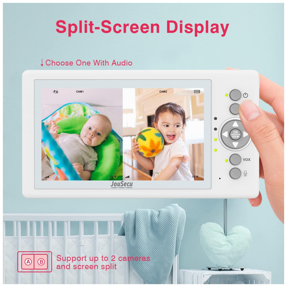 Tela com tela dividida A tela grande permite que você tenha um ângulo de visão maior para prestar atenção ao seu bebê. Com o modo splitscreen, exibindo simultaneamente o vídeo e o áudio capturados por duas câmeras.