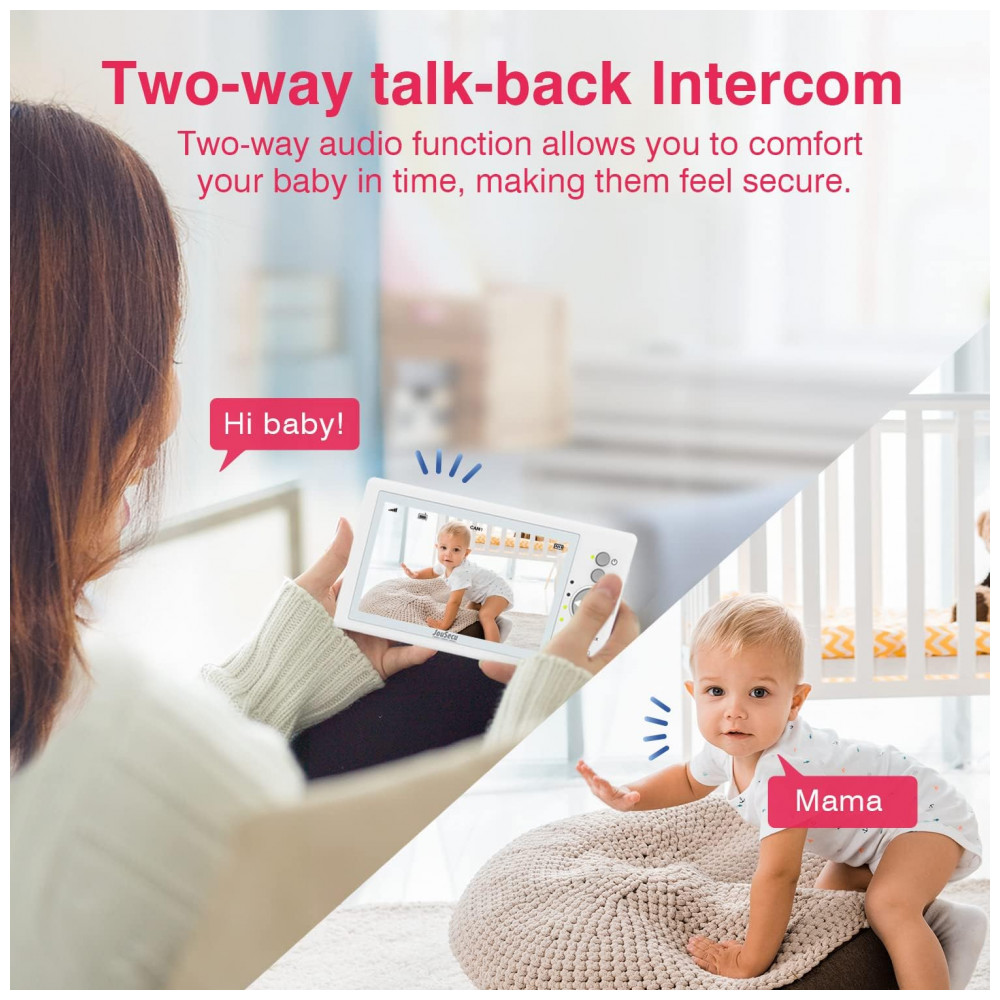 Áudio de duas vias e visão noturna clara A função de áudio de duas vias permite que você conforte seu bebê a tempo, fazendo com que ele se sinta . A visão noturna pode ser ativada ou desativada automaticamente de acordo com o brilho do ambiente. Você ainda pode ver seu bebê claramente, mesmo à noite.