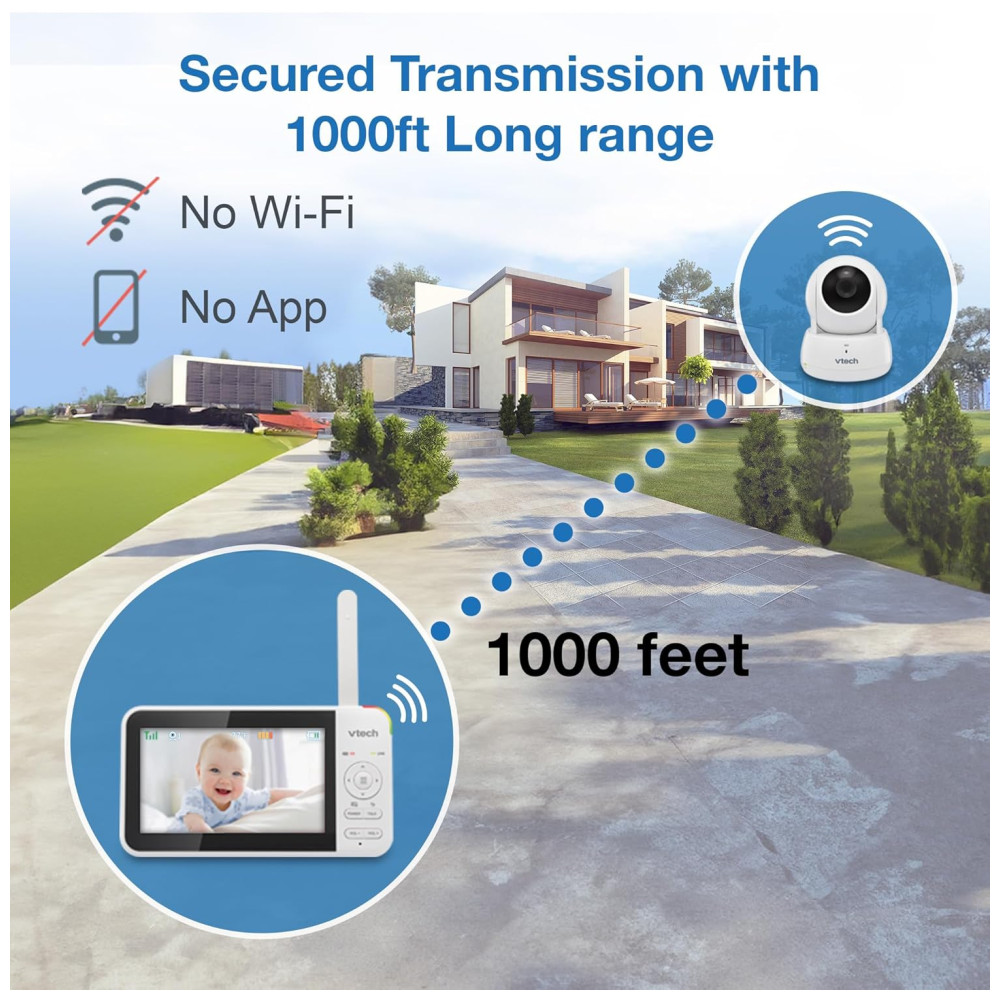 O VTech Video Baby Monitor VM924 também oferece sons suaves e canções de ninar para acalmar o bebê, além de um interfone integrado para conversa bidirecional em qualquer cômodo da casa. E com um alcance de até 303,95 metros, você pode ficar conectado com seu bebê mesmo no quintal. Sem necessidade de emparelhamento ou conexões WiFi, o monitor está pronto para uso imediato com transmissão segura.