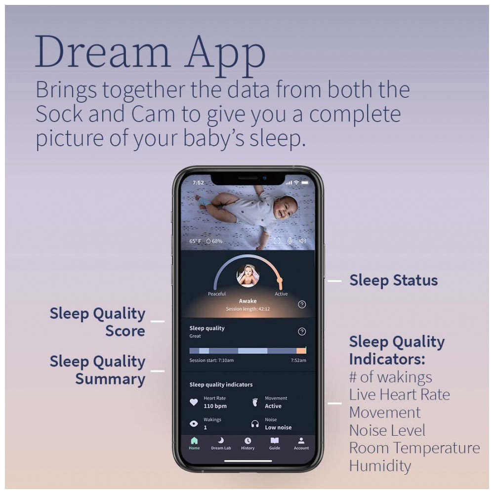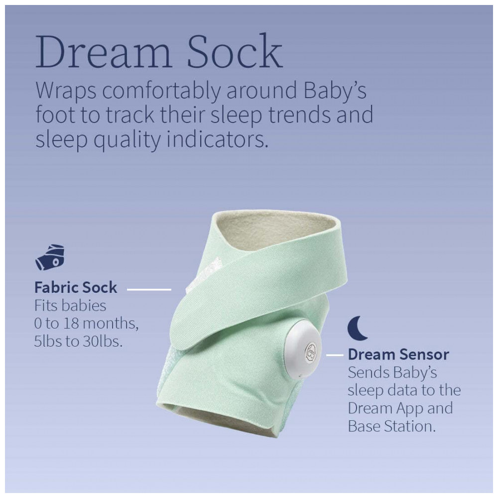 Acompanhe as tendências de sono do seu bebê. A Dream Sock é usada para cada soneca e hora de dormir e usa tecnologia confiável para monitorar o sono do seu bebê, incluindo acordar, frequência cardíaca, qualidade do sono e total de horas dormidas.