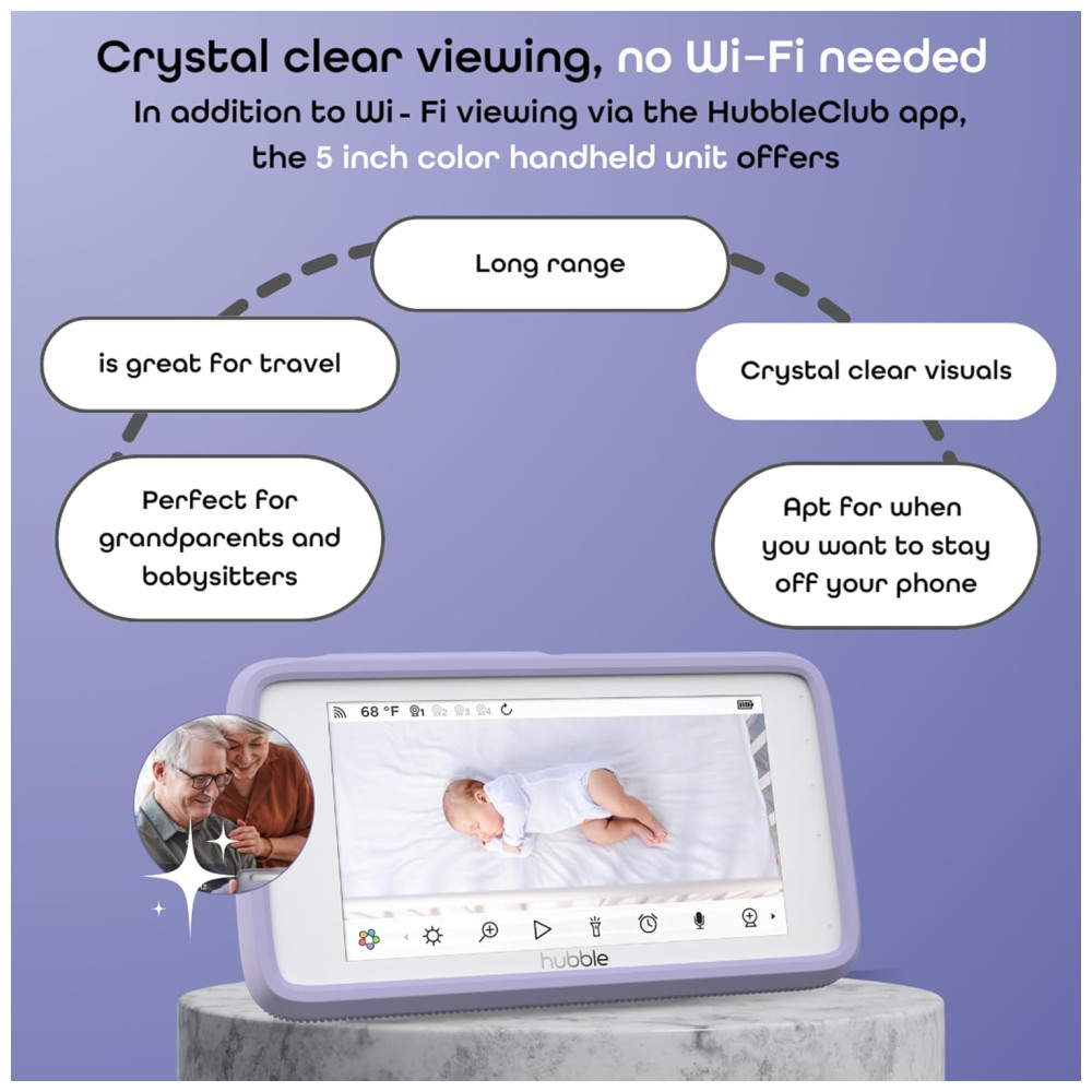 Com uma unidade dos pais de 5 polegadas com tela sensível ao toque, o monitor oferece uma visualização fácil no modo sem Wi-Fi, ideal para avós ou babás. Para mais conveniência, você pode também acessar a transmissão ao vivo via modo Wi-Fi, com segurança adicional através do aplicativo HubbleClub, que utiliza criptografia para garantir a proteção contra hackers.