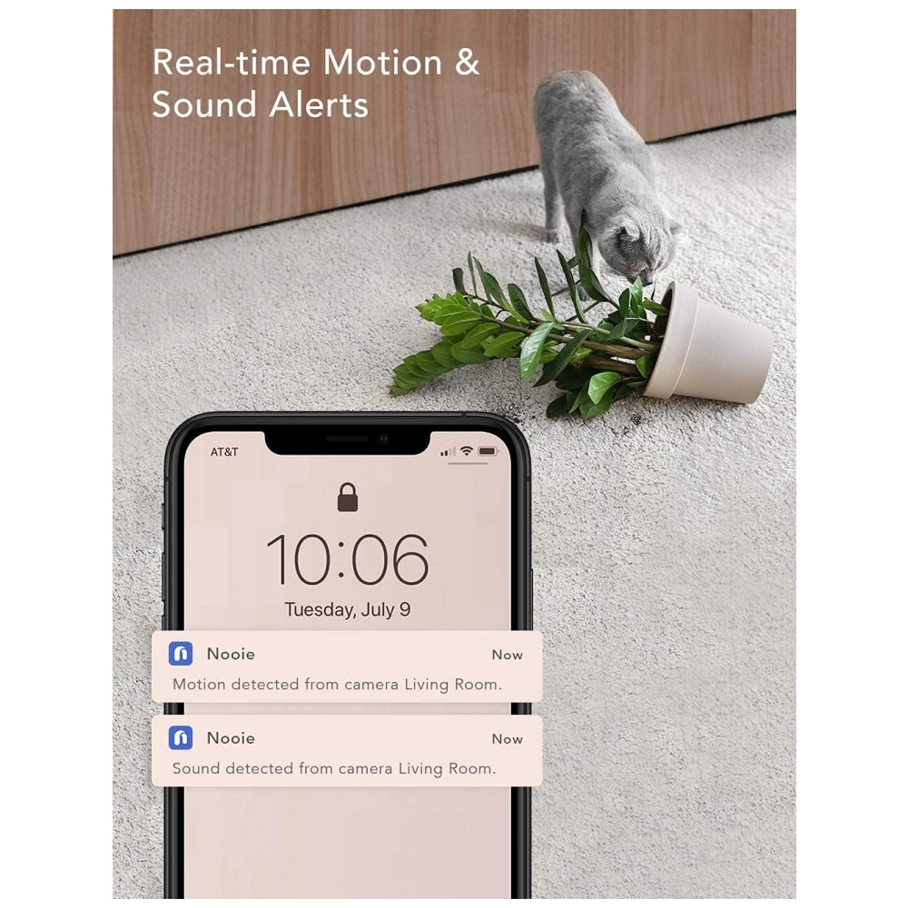Detecta e rastreia automaticamente a ação em sua casa em 360. Nooie Cam 360 tem campo de visão de 101 gira 355 horizontalmente e 94 verticalmente. Pan e tilt facilmente com o Nooie App.