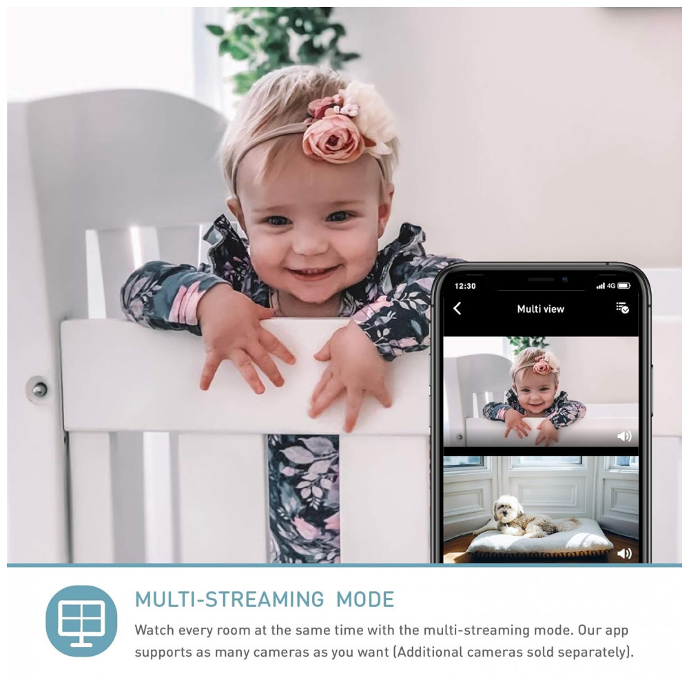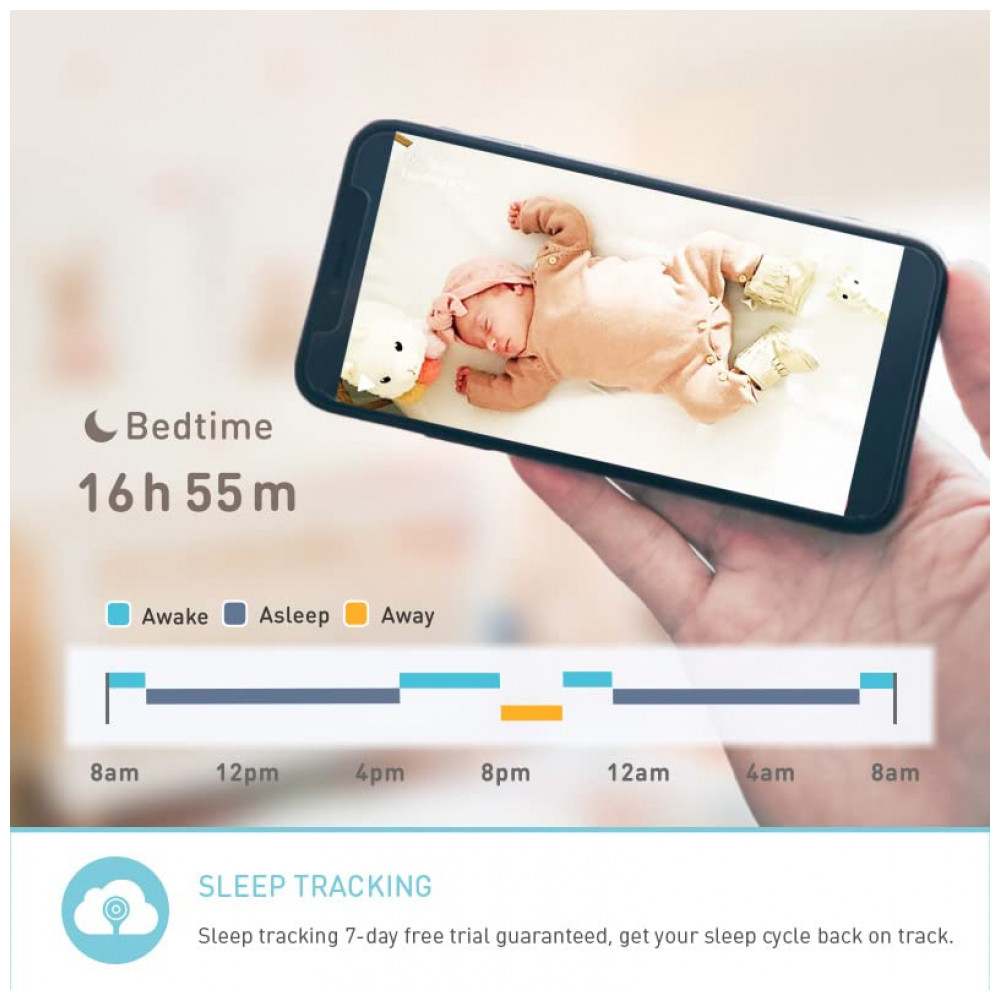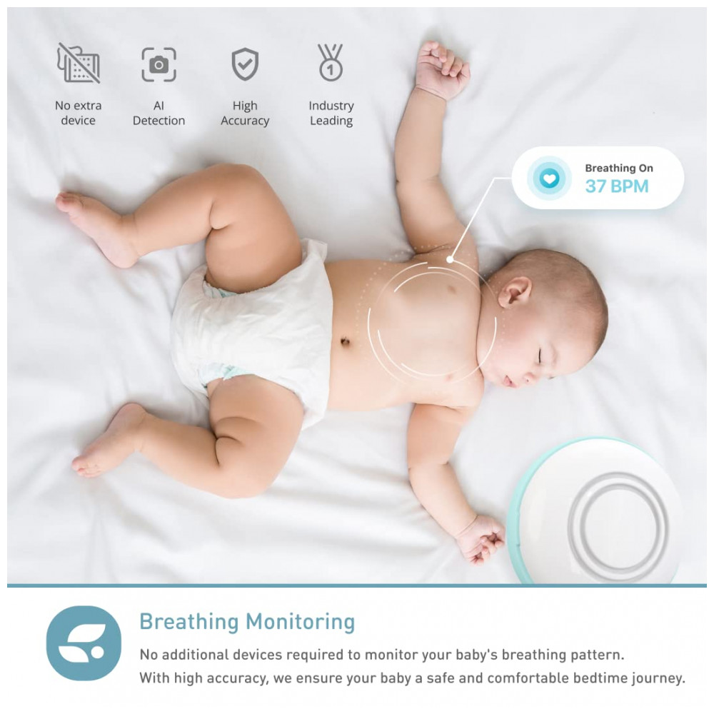 Monitoramento de respiração sem contato Assinatura necessária Não é necessário nenhum sensor vestível extra. Monitore a respiração do seu bebê pela tecnologia AI e você poderá visualizar a frequência respiratória e o histórico da posição de dormir do seu bebê.