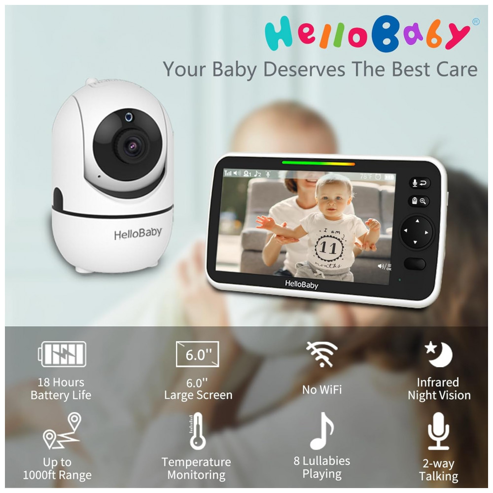 Babá Eletrônica com Divisão de Tela HelloBaby 6 IPS – Sem WiFi – Visão Noturna Infravermelha – Pan/Tilt/Zoom – 2 Vias de Áudio – 8 Canções de Ninar