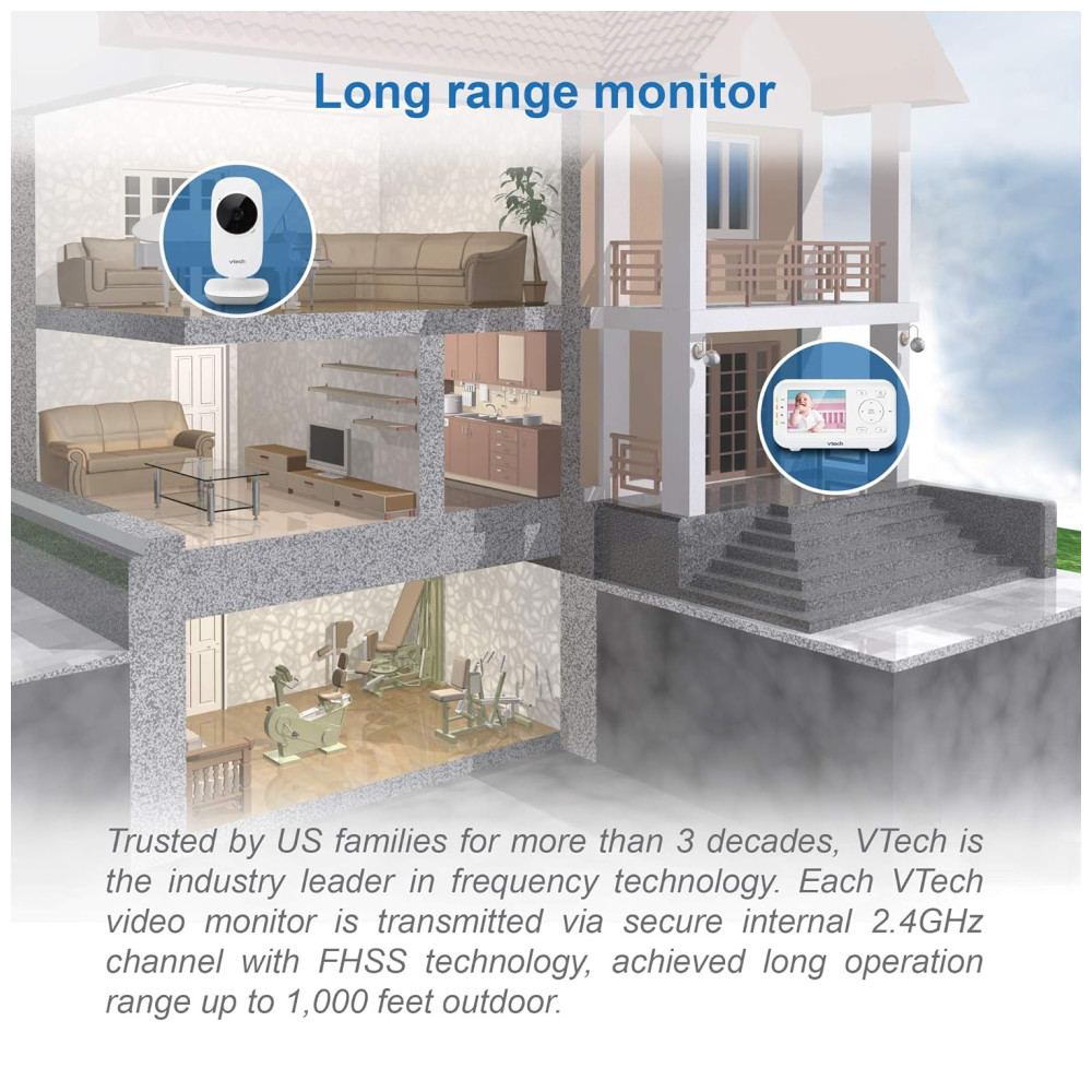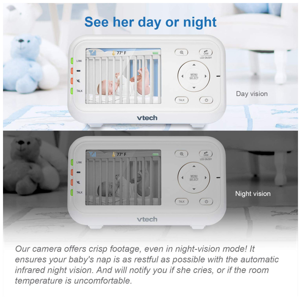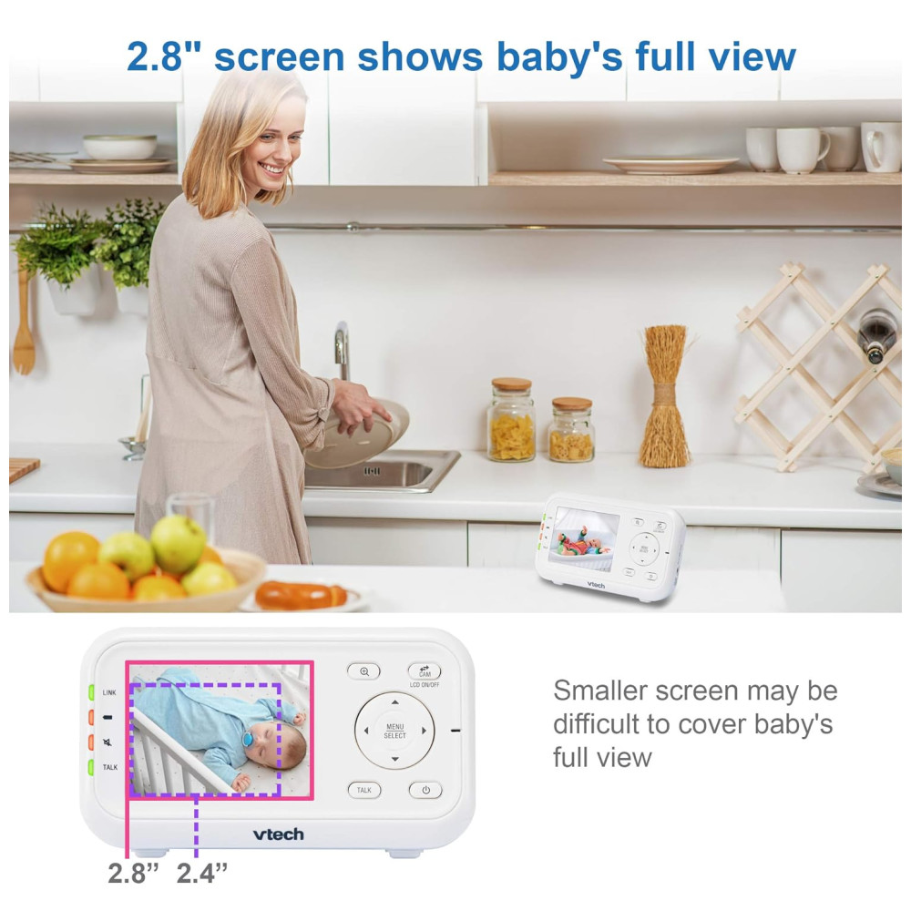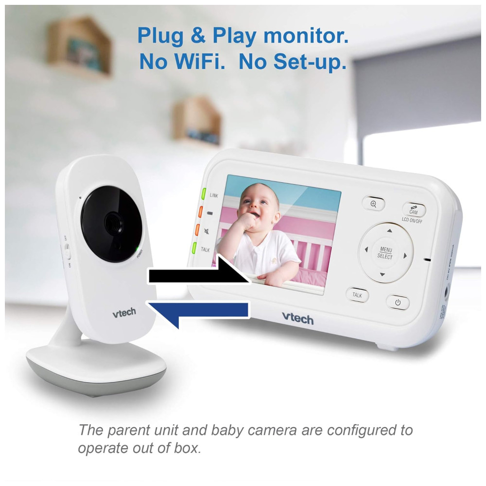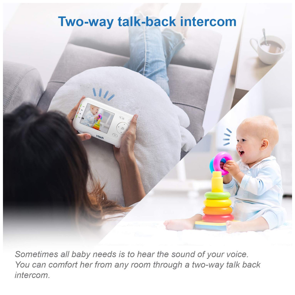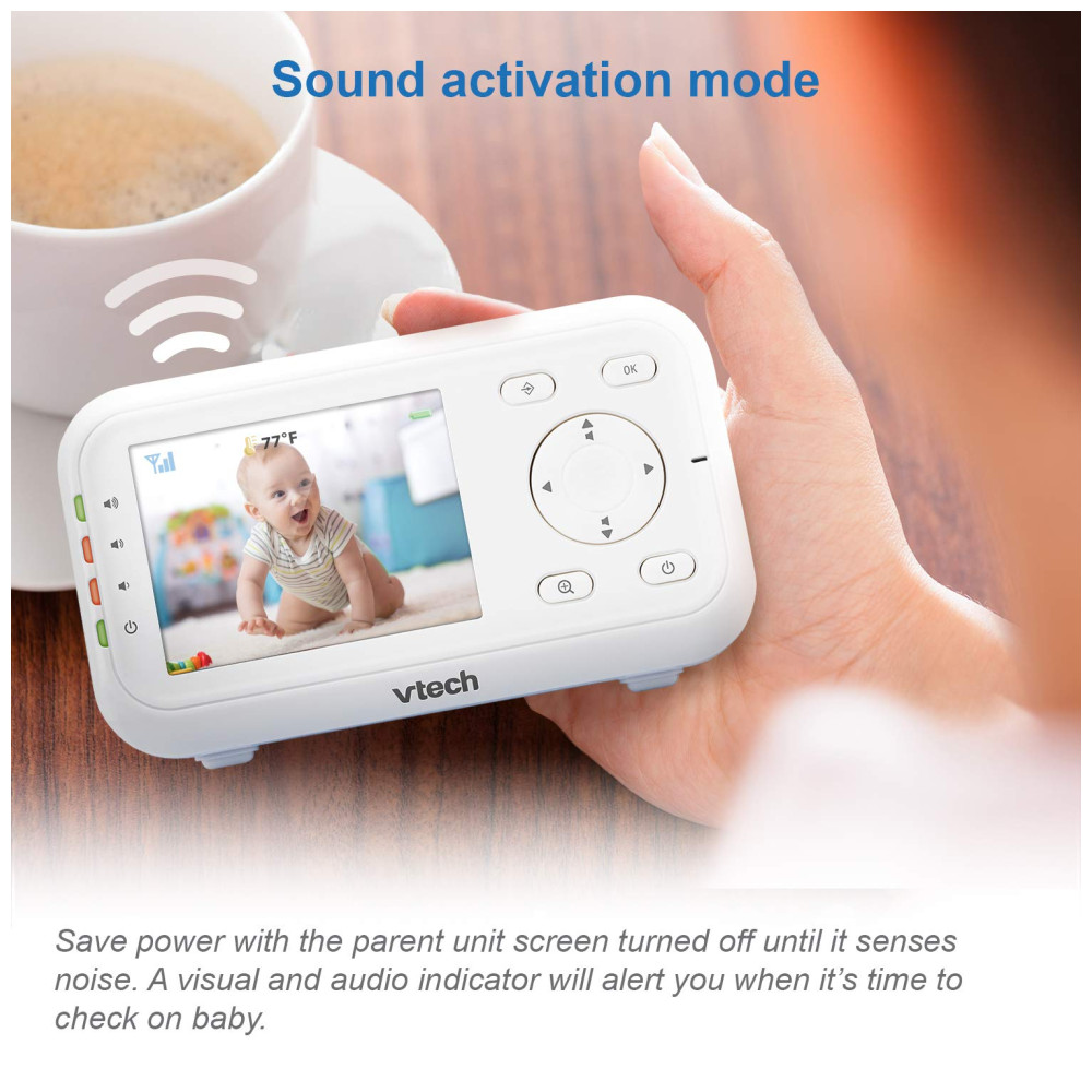 O Monitor de Bebê com Vídeo Digital VTech VM3252 2.8 possui uma tela de alta resolução que permite visualizar o bebê de qualquer cômodo da casa. Com a câmera ajustável, é possível escolher a melhor posição para obter a melhor visualização na unidade dos pais, que possui um LCD colorido de 7 cm. O intercomunicador bidirecional permite que os pais se comuniquem com o bebê, e as suaves canções de ninar podem ajudá lo a dormir melhor. A visão noturna automática oferece uma visão clara do berço sem perturbar o sono do bebê, e o sensor de temperatura integrado alerta os pais caso a temperatura no berçário esteja desconfortável. A babá eletrônica VM3252 é fácil de usar, com configuração plug and play e funções intuitivas na unidade dos pais. Com um alcance de até 303,95 metros, os pais podem monitorar o bebê de outros cômodos ou até mesmo do quintal. O monitor também possui um modo de ativação de som que economiza energia e um sensor de temperatura que alerta quando é hora de ajustar o termostato.