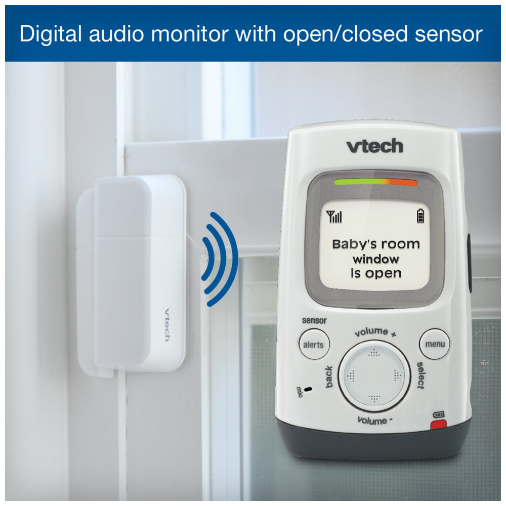Babá eletrônica digital para bebês VTech DM271102 DECT 6.0 é uma ótima opção para pais que desejam manter se conectados aos seus filhos com segurança e tranquilidade. Com uma conexão DECT 6.0 segura, você pode ouvir todos os sons que seu bebê faz sem se preocupar com mais ninguém ouvindo. Além disso, o sensor aberto fechado colocado em portas, armários ou janelas fornece alertas visuais e sonoros para informar se a porta estiver aberta, mantendo você informado sobre a localização do seu filho.