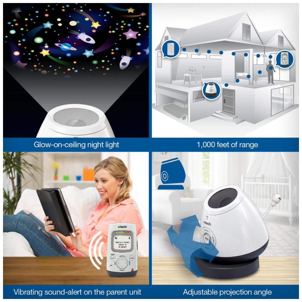 Esta babá eletrônica digital DECT 6.0 VTech DM271102 com sensor aberto fechado também possui recursos extras em um único dispositivo. A unidade do bebê funciona como uma luz noturna de teto brilhante que projeta estrelas e a lua no teto, proporcionando um ambiente tranquilo e confortável para o seu bebê dormir. Além disso, o DM271102 toca uma canção de ninar suave para acalmar seu bebê durante o tempo de silêncio. Outros recursos incluem um interfone bidirecional, clipe de cinto integrado e até 303,95 metros de alcance, permitindo que você permaneça conectado durante todo o dia.