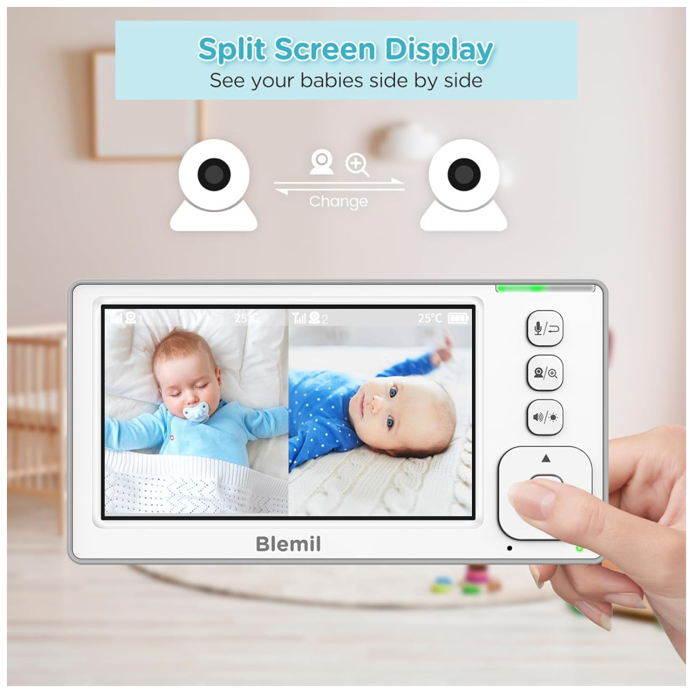 Babá Eletrônica com Monitor de Tela Dividida Bateria de 29H 2 Câmeras e Áudio Sem WiFi Blemil BL9046-2 Branca
