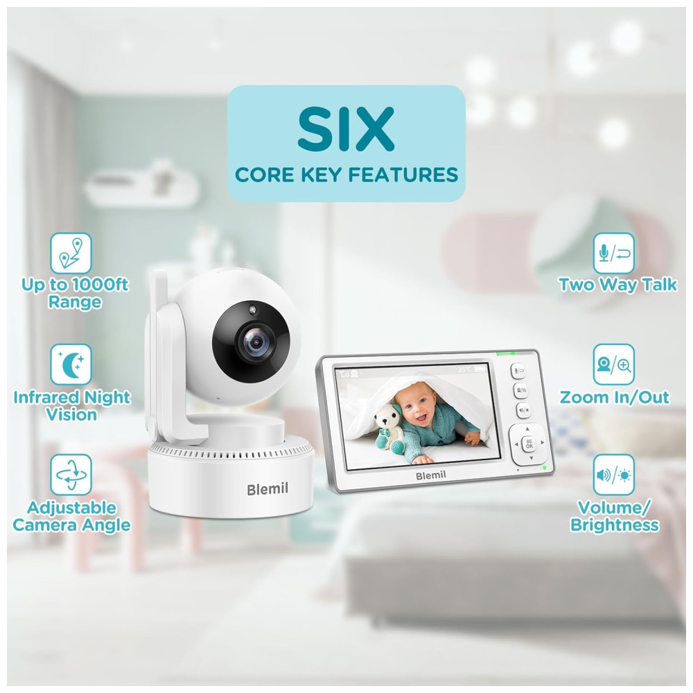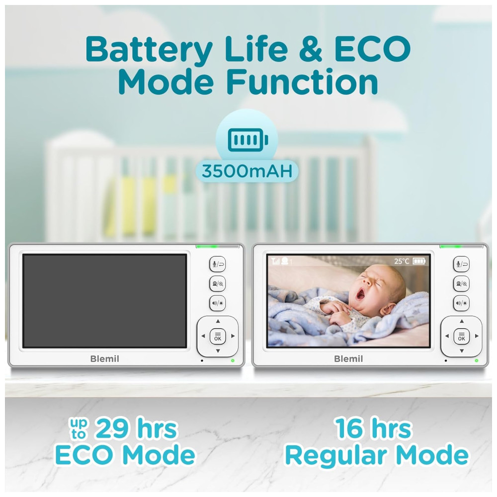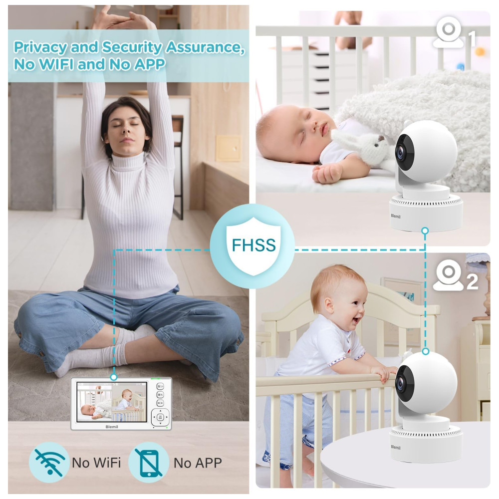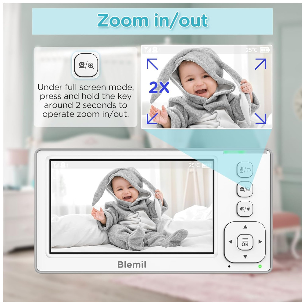 Atualizamos o modo sonoro de tela dividida da babá eletrônica com duas câmeras Blemil para proporcionar uma experiência ainda melhor para os pais cuidarem de seus filhos. Com a nova geração de tela IPS, a visão dos anjos é ampla e as cores são vivas e claras, permitindo que você tenha uma alta qualidade de imagem para se concentrar em cuidar de cada detalhe do seu filho. As duas câmeras remotas podem girar 320 horizontalmente e 120 verticalmente e possuem ampliação de zoom 2X para cobertura abrangente, garantindo que você possa ver seu bebê claramente de qualquer ângulo. O modo VOX de visão noturna clara permite que você veja seu bebê no escuro e pausa a transmissão da imagem quando o quarto do bebê estiver silencioso, sendo reativado com base no som do quarto do bebê. O monitor de vídeo para bebês Blemil é fácil de usar, com ajustes diretos de volume e brilho pelos botões, e é adequado como um ótimo presente para mães novatas e bebês recém nascidos.