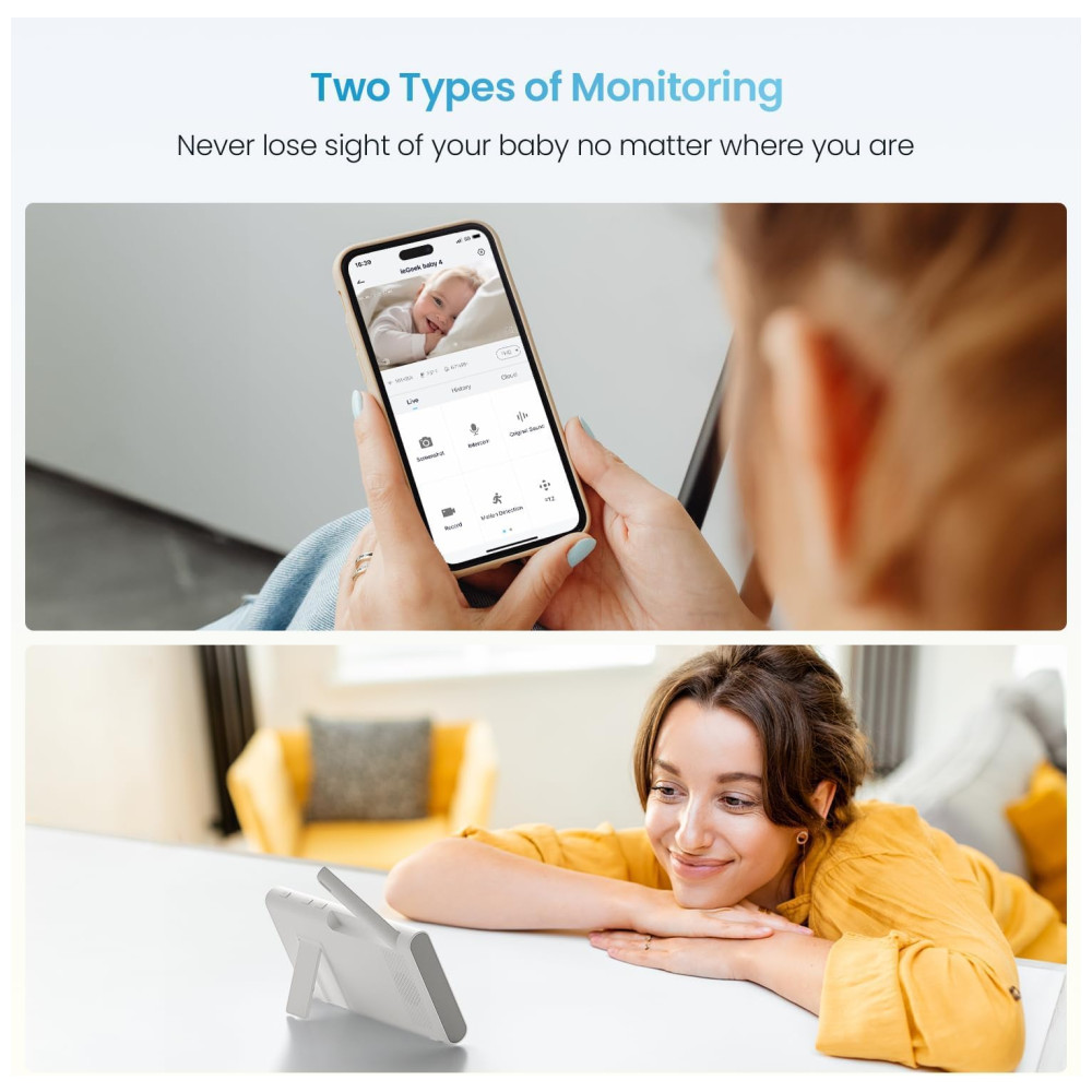 Vigilância Ininterrupta: Experimente vigilância ininterrupta com nossa câmera de vídeo para bebês, oferecendo controle duplo por meio tela de 11 cm e um aplicativo gratuito dedicado. Conecte-se à tela do monitor sem WiFi e permaneça conectado em qualquer lugar com suporte a WiFi de 2,4 GHz para uso de aplicativo móvel. Nosso monitor garante que você esteja sempre a apenas um olhar de distância, onde quer que esteja.