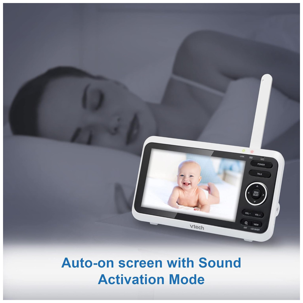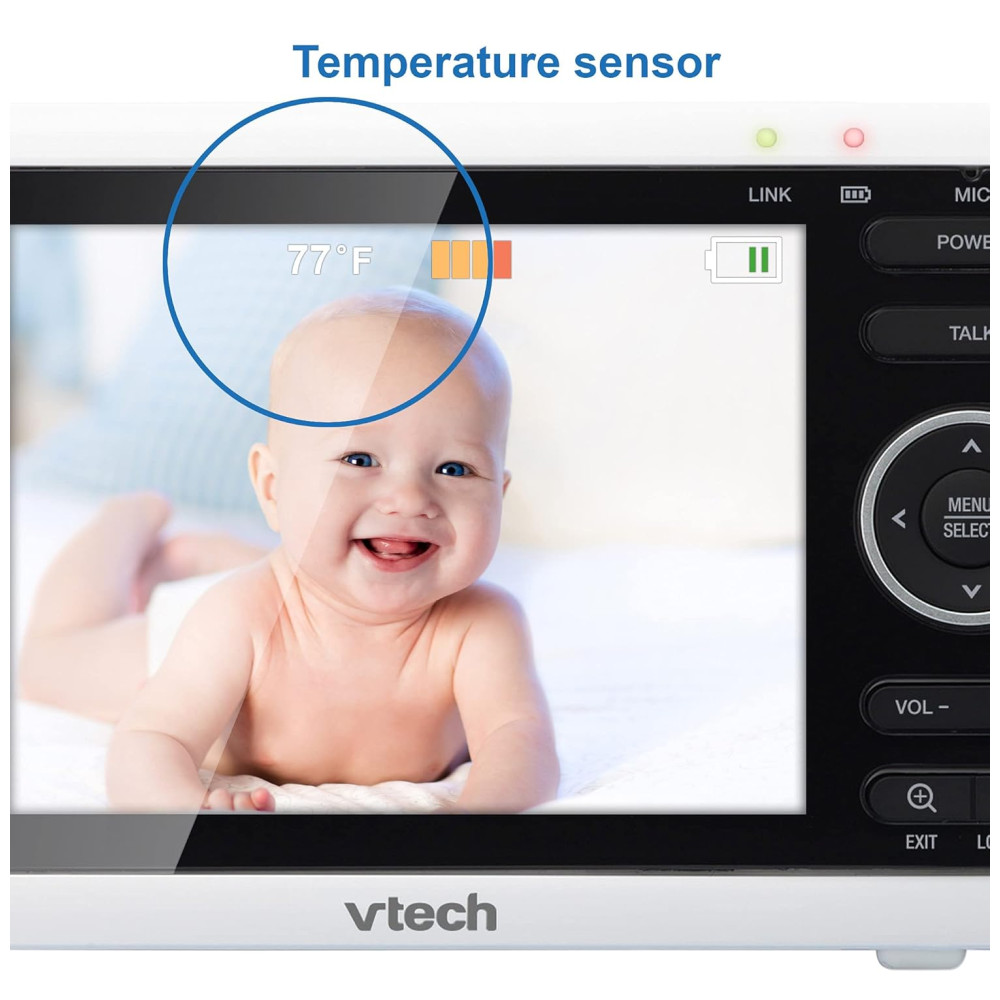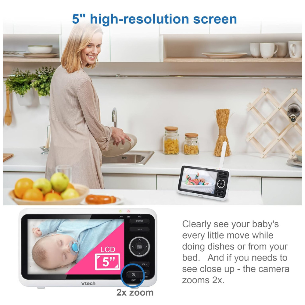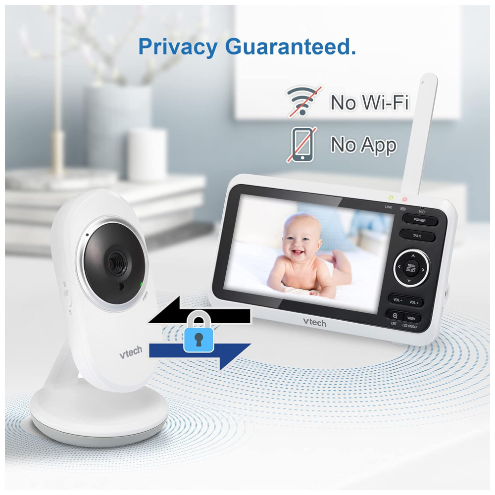 Mantenha um olho no seu bebê com a Babá Eletrônica de Vídeo Digital VTech VM350 5. Com uma tela LCD de alta resolução de 5 polegadas e visão noturna automática, você pode ver claramente seu bebê de qualquer lugar da casa ou quintal. A câmera fixa oferece zoom 2x e imagens coloridas durante o dia e imagens infravermelhas em escala de cinza à noite. Além disso, a babá eletrônica apresenta sons suaves e canções de ninar que tocam diretamente na unidade da câmera para ajudar o bebê a dormir bem. O sensor de temperatura integrado também alerta quando o quarto do bebê estiver ficando muito quente ou muito frio. A bateria recarregável tem uma duração de até 12 horas de streaming de vídeo e 21 horas de monitoramento somente de áudio, com uma única carga, permitindo monitorar seu bebê facilmente durante toda a noite. A babá eletrônica é transmitida através de um canal interno seguro de 2,4 GHz com tecnologia FHSS, garantindo a privacidade da sua família. Com a opção de conversa bidirecional, você pode falar com seu bebê de onde estiver. A tela do monitor pode ser desligada e o som silenciado para lhe dar o silêncio necessário e economizar energia. A babá eletrônica é fácil de configurar e não requer emparelhamento ou conexões. A câmera pode ser colocada em cima de uma mesa ou montada na parede.